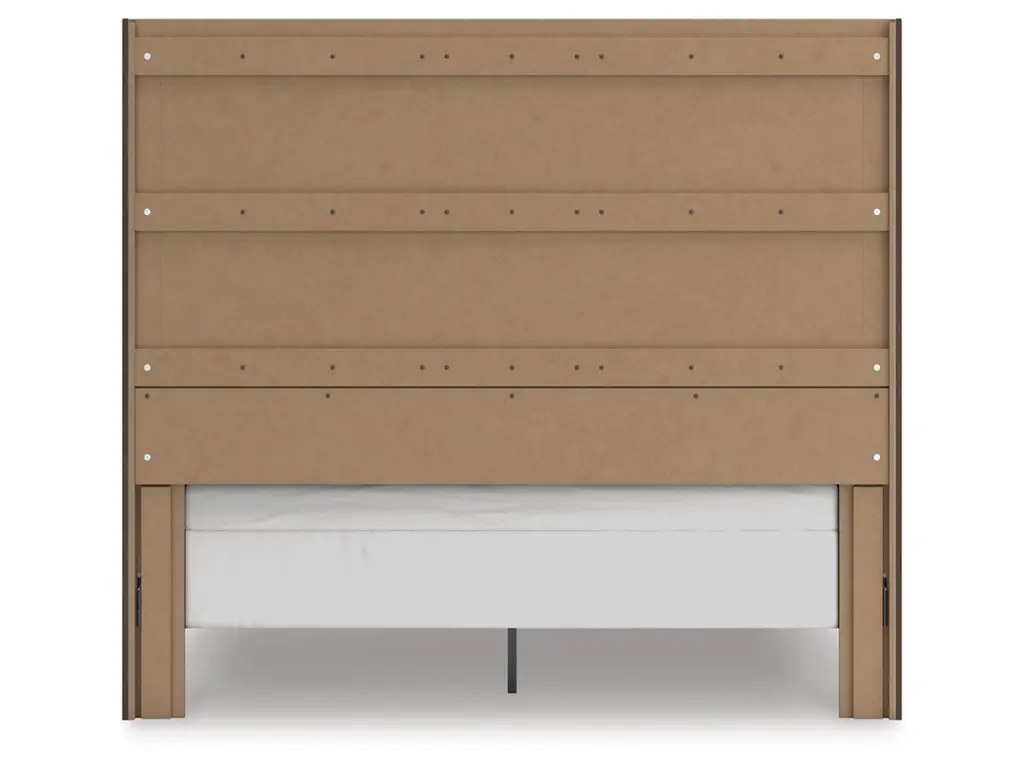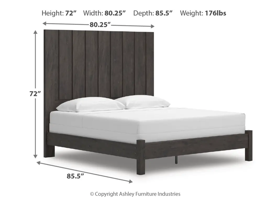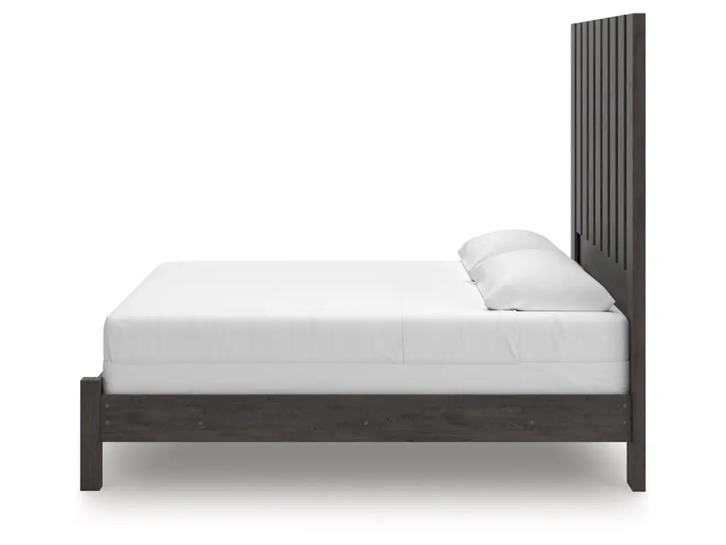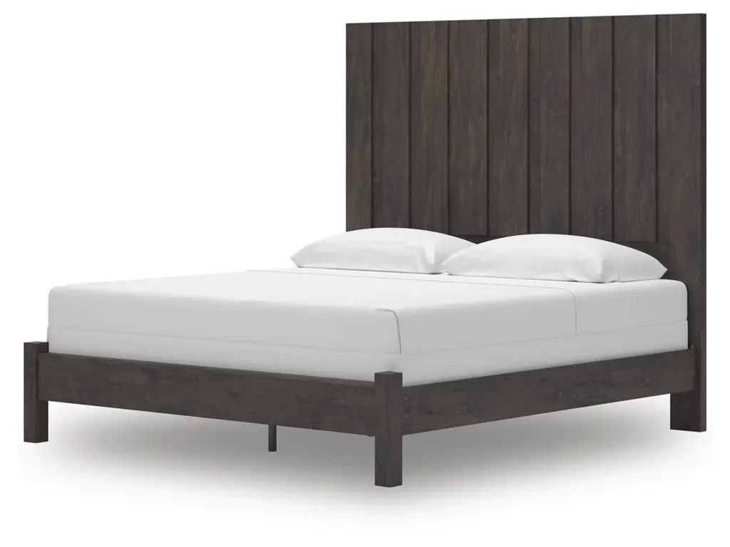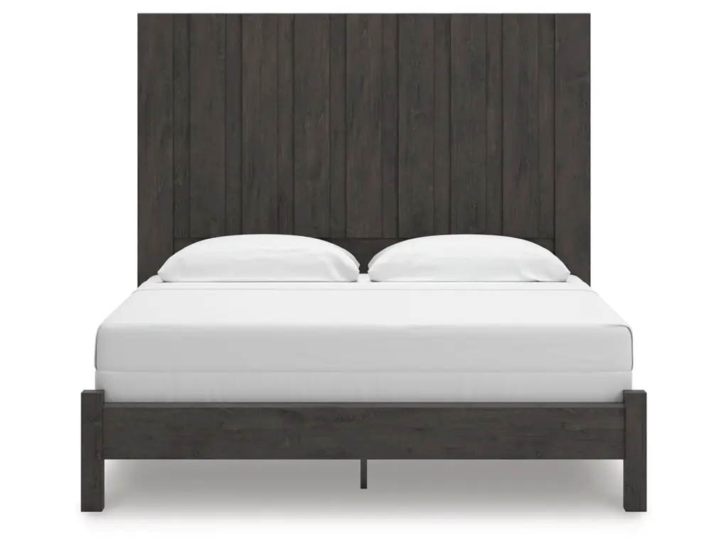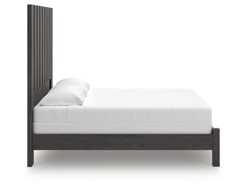 Find serene simplicity in the clean lines and dark neutral tones of the Parlayon king panel bed. It’s a sincere approach to modern elegance, giving you high style at a great value. Vertical planks decorate the generously scaled headboard to give the illusion of additional height, polishing off the piece in grand fashion.