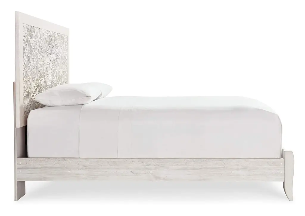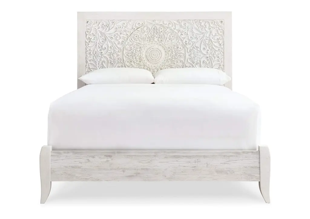 Your young trendsetter can live out her free spirit with the Paxberry queen bed. Exquisite carved medallion pattern is a testament to true style. Charming whitewashed finish sets a foundation for a room bursting with personality. Headboard legs have four height options to grow with your child. Weight 110.300 lbs. (49.64kgs.)