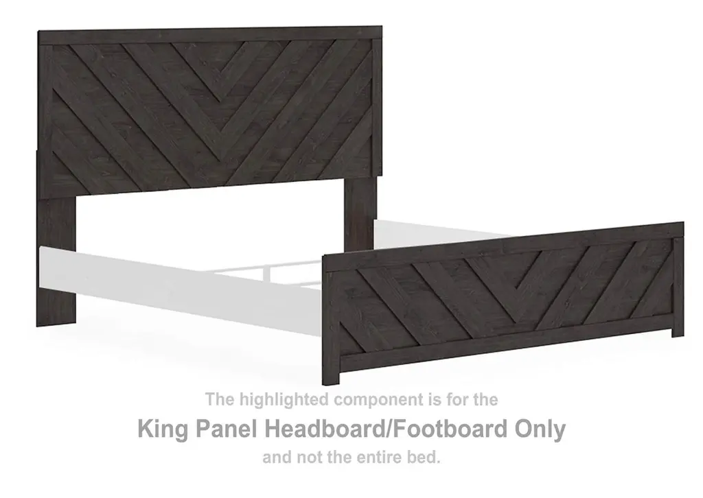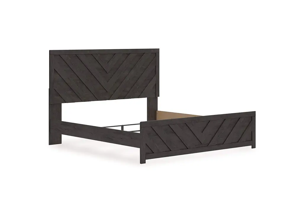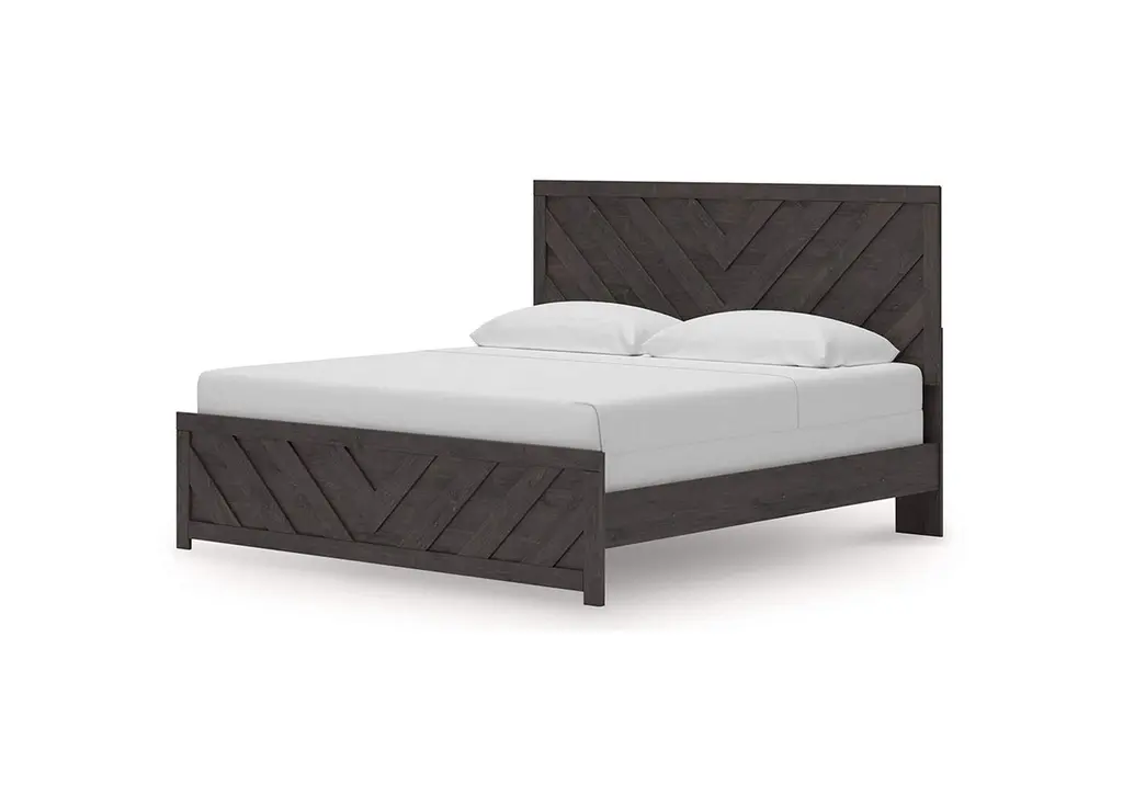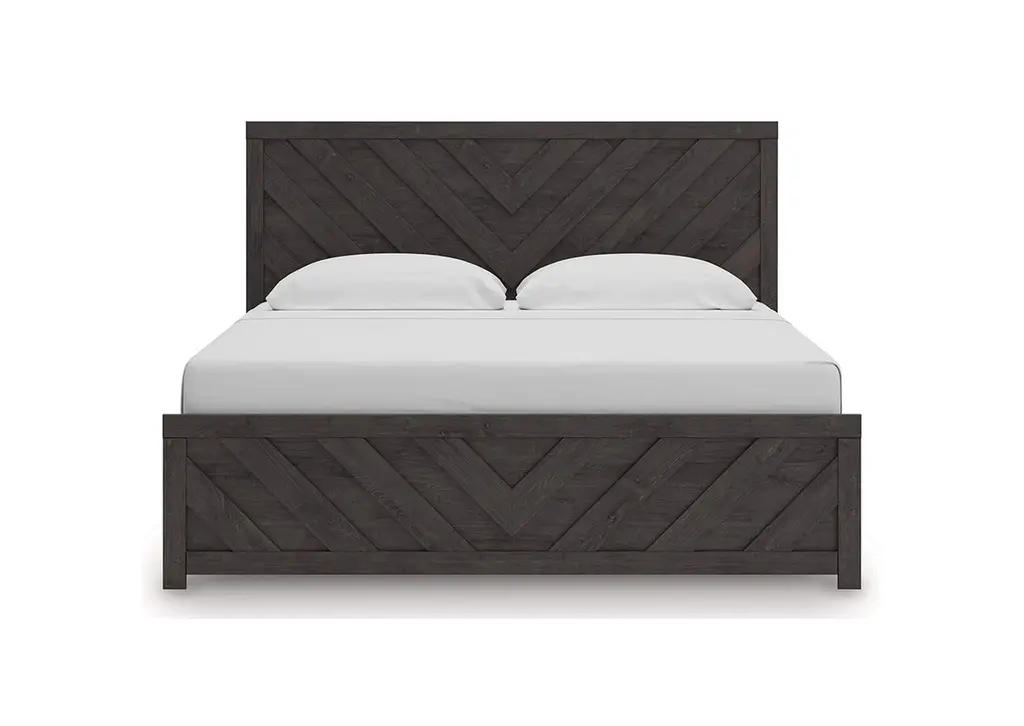 Designed with everyday style in mind, the Prendonea king panel bed is a simply chic approach to modern living. A dark charcoal finish blends black and brown undertones to create a versatile look that effortlessly pairs with your existing pieces. And for an extra dash of trend-right style, the headboard is dressed in a playful chevron pattern. Weight 155.000 lbs. (69.75kgs.)