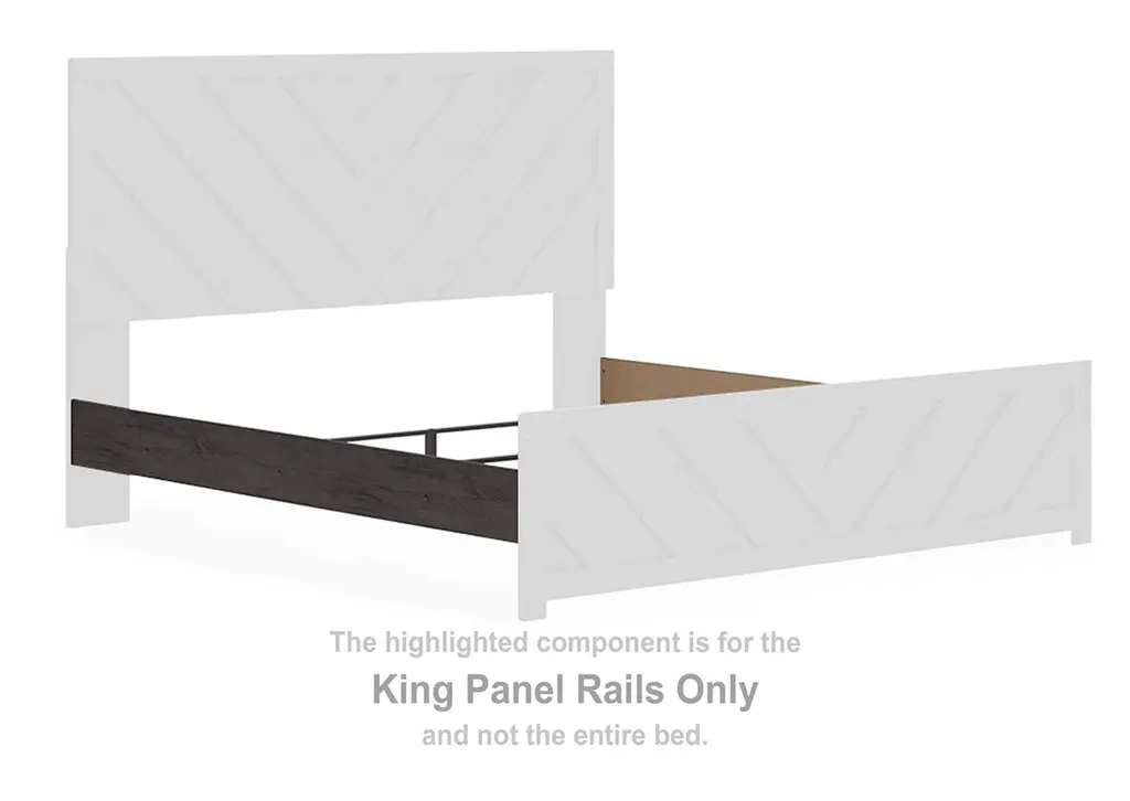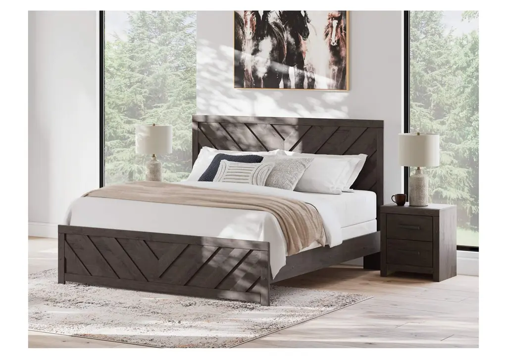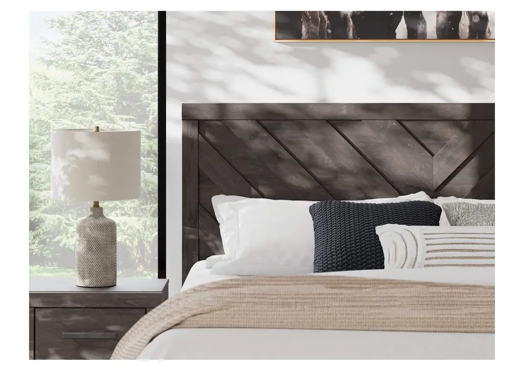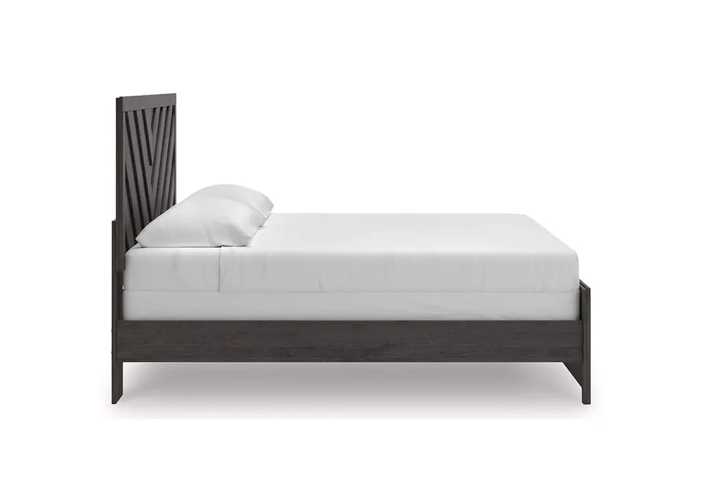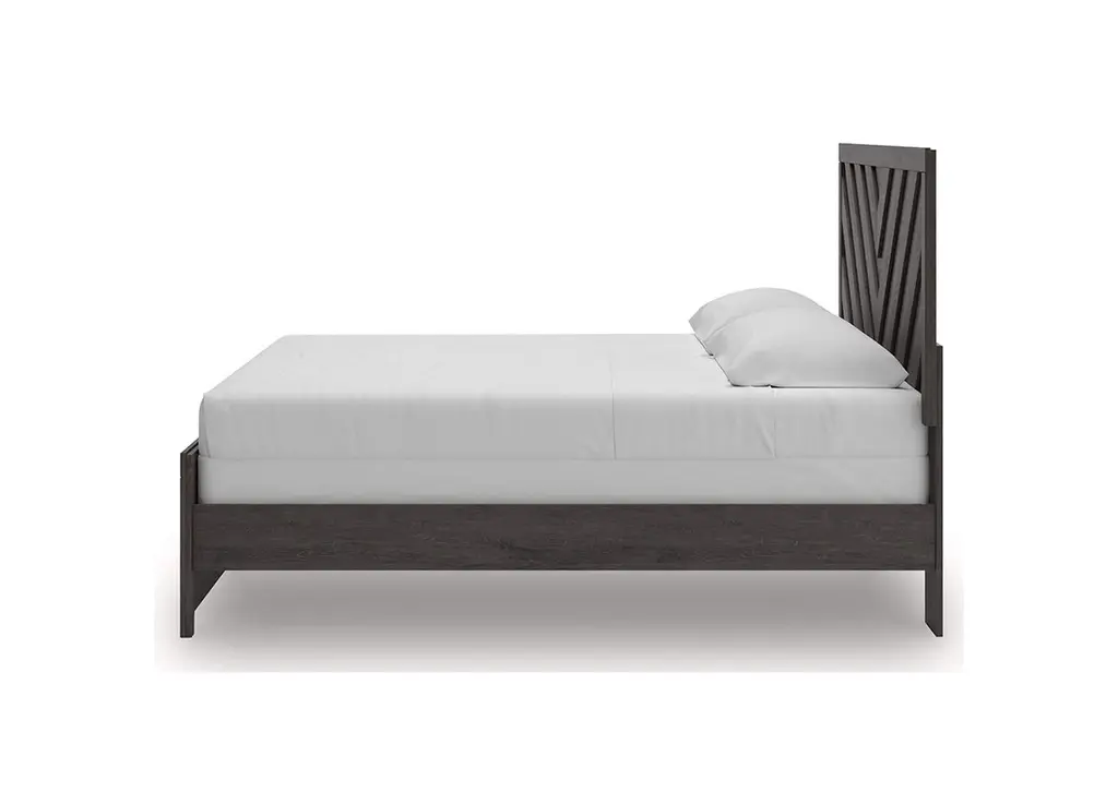 Designed with everyday style in mind, the Prendonea king panel bed is a simply chic approach to modern living. A dark charcoal finish blends black and brown undertones to create a versatile look that effortlessly pairs with your existing pieces. And for an extra dash of trend-right style, the headboard is dressed in a playful chevron pattern. Weight 155.000 lbs. (69.75kgs.)