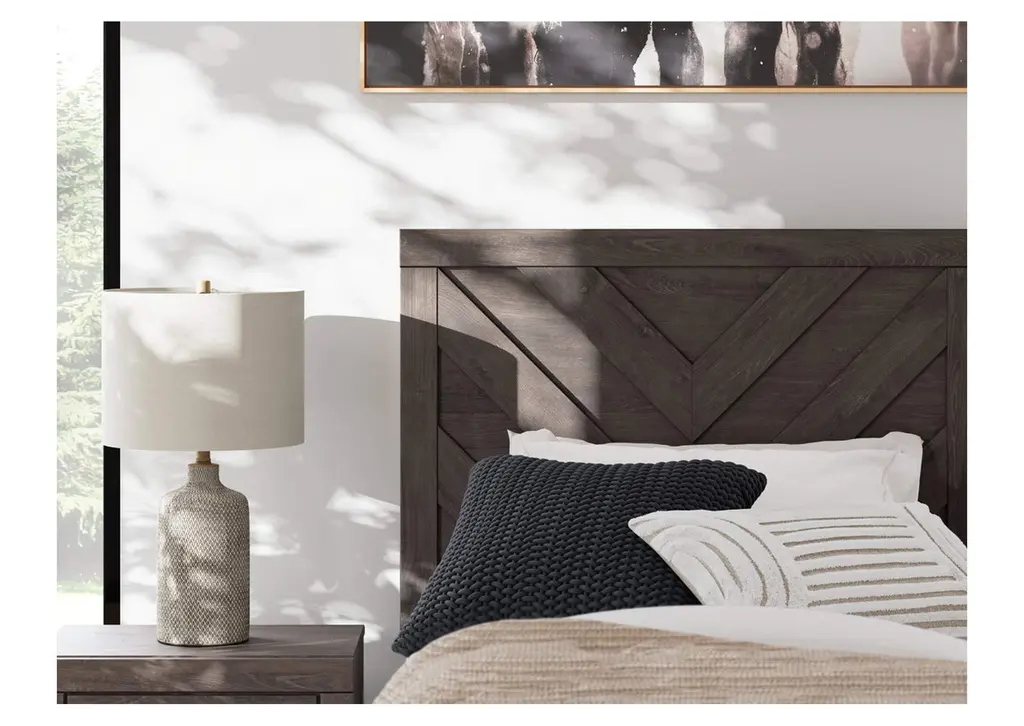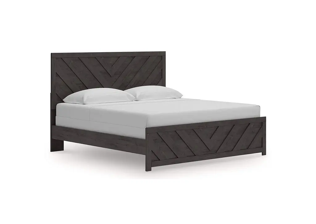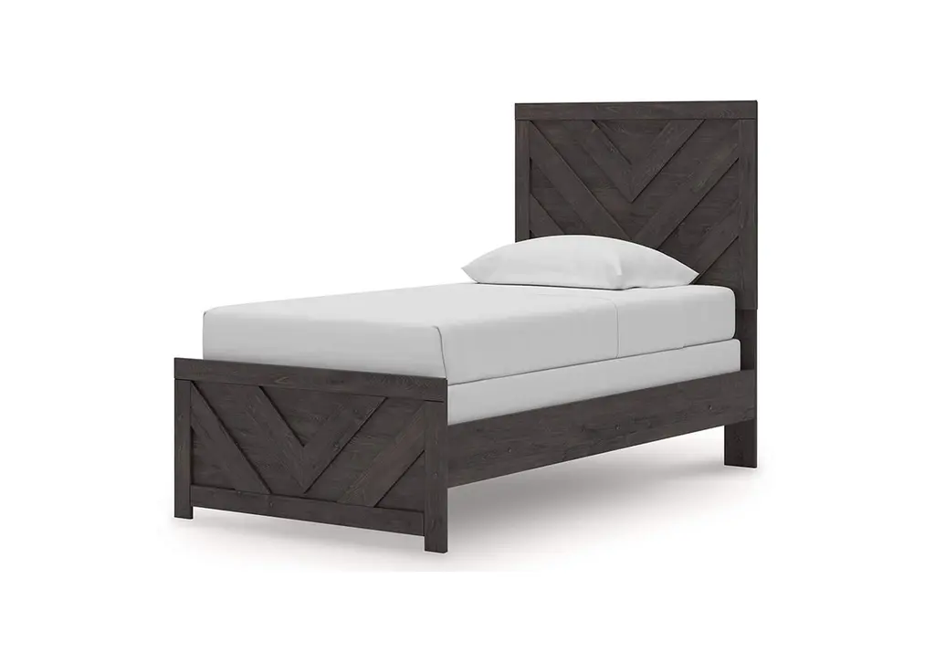Designed with everyday style in mind, the Prendonea twin panel bed is a simply chic approach to modern living. A dark charcoal finish blends black and brown undertones, creating a versatile look that effortlessly pairs with your existing pieces. And for an extra dash of trend-right style, the headboard is dressed in a playful chevron pattern. Weight 100.000 lbs. (45kgs.)