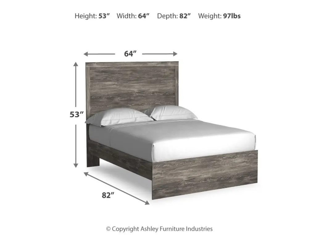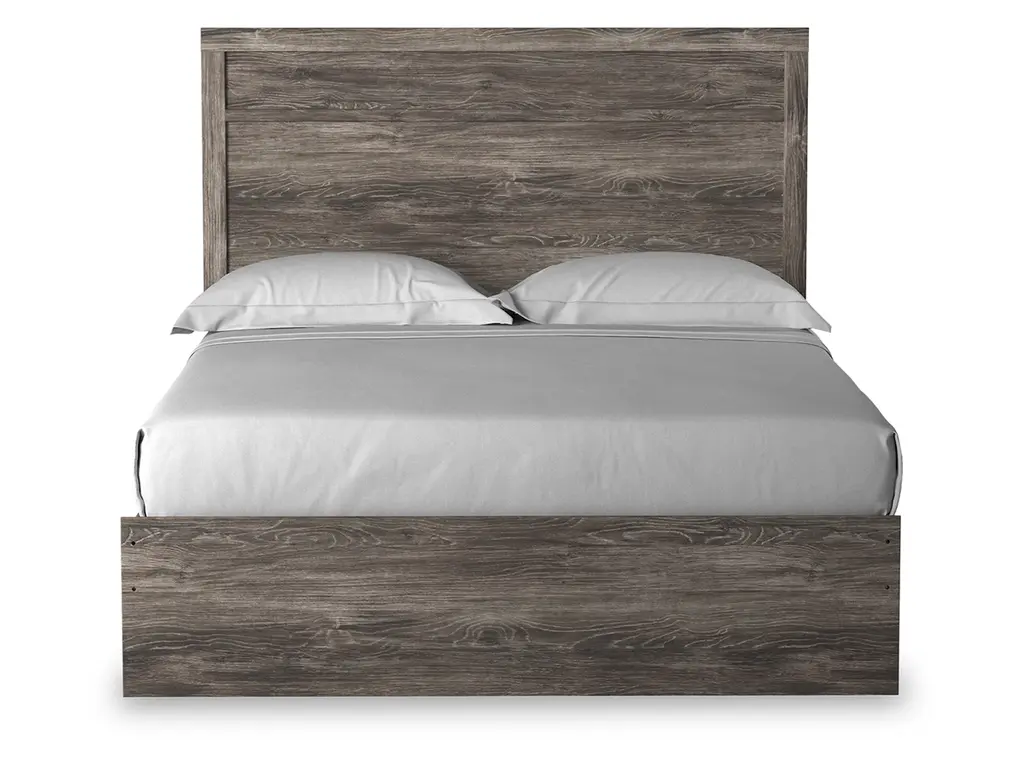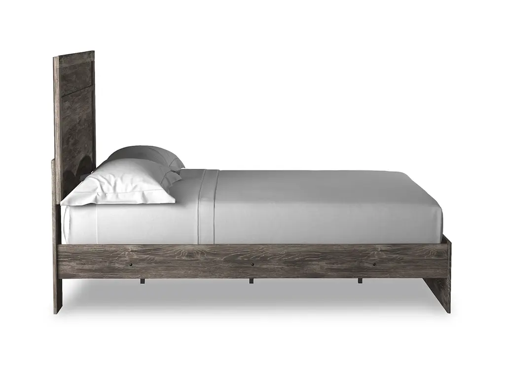 With its clean-lined look and modern attitude, the Ralinksi queen panel bed is a fresh style awakening. A warm gray hue over replicated oak grain easily complements other furniture finishes. The simple, unadorned profile is given depth and dimension with the addition of plank-style moulding on the headboard—proof that beauty lies in the details.