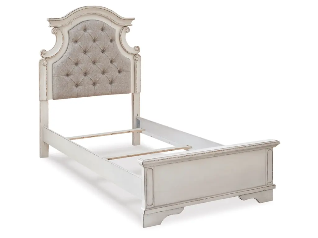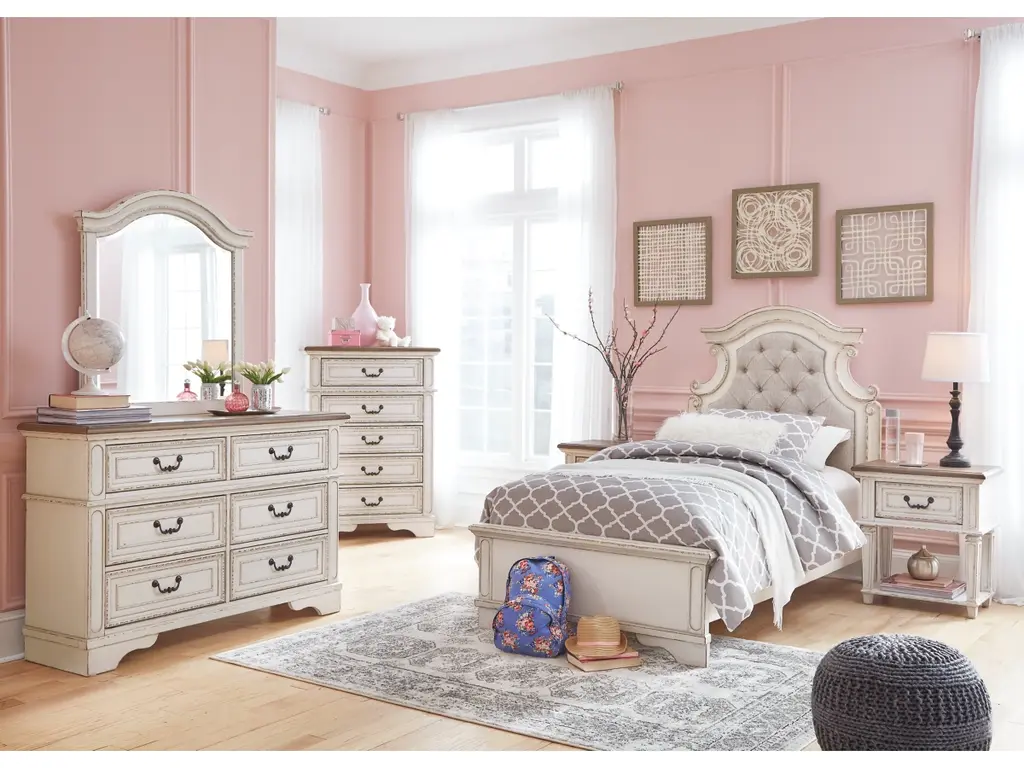 Elevating the art of traditional cottage styling, the Realyn full upholstered bed is your dream bedroom retreat realized. A curvaceous beauty, this brilliant upholstered bed wows with dramatic scalloped details and fanciful trim work and charms with a distressed chipped white finish for heirloom appeal. Deep tufting on the cushioned upholstered headboard adds such a cozy element sure to please. Mattress and foundation/box spring available, sold separately.