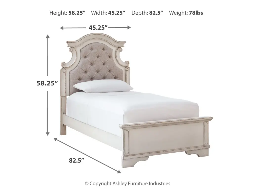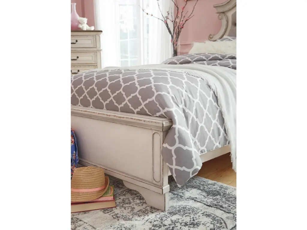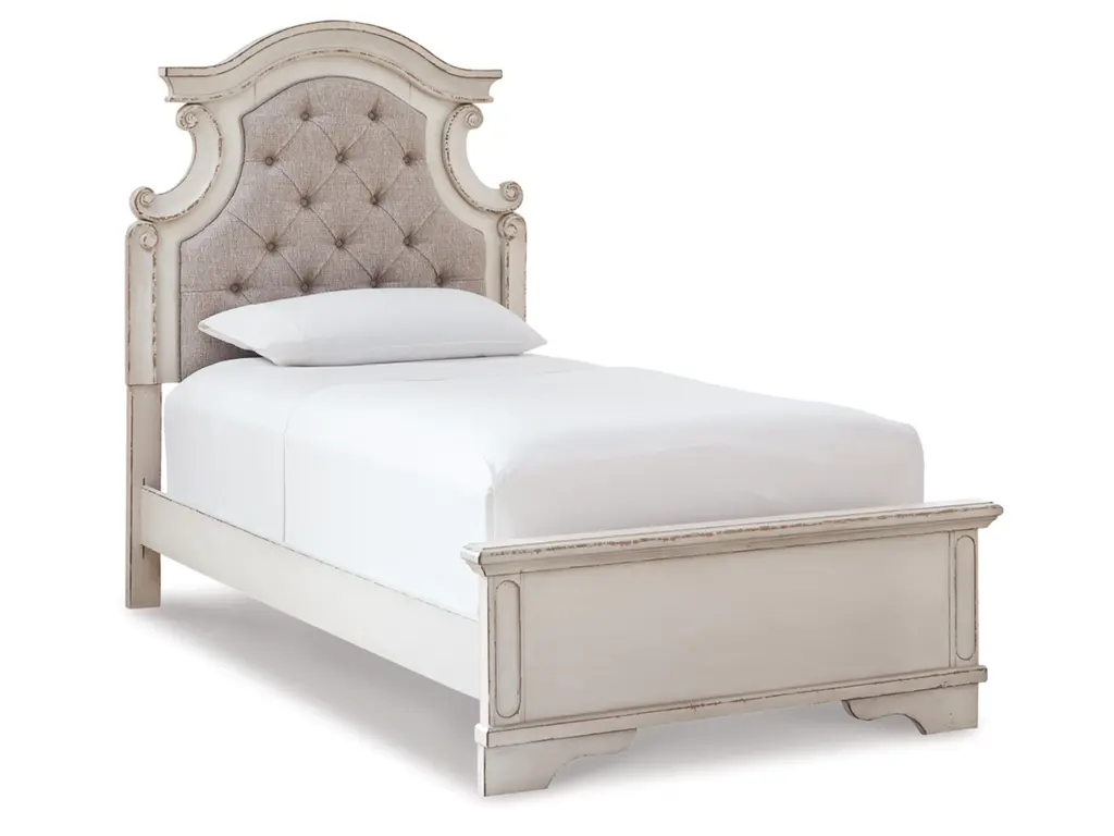 Elevating the art of traditional cottage styling, the Realyn twin upholstered bed is your dream bedroom retreat realized. A curvaceous beauty, this brilliant upholstered bed wows with dramatic scalloped details and fanciful trim work. The distressed chipped white finish charms with its heirloom appeal. Deep tufting on the cushioned upholstered headboard adds such a cozy element sure to please. Mattress and foundation/box spring available, sold separately.