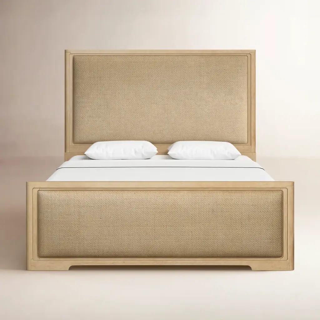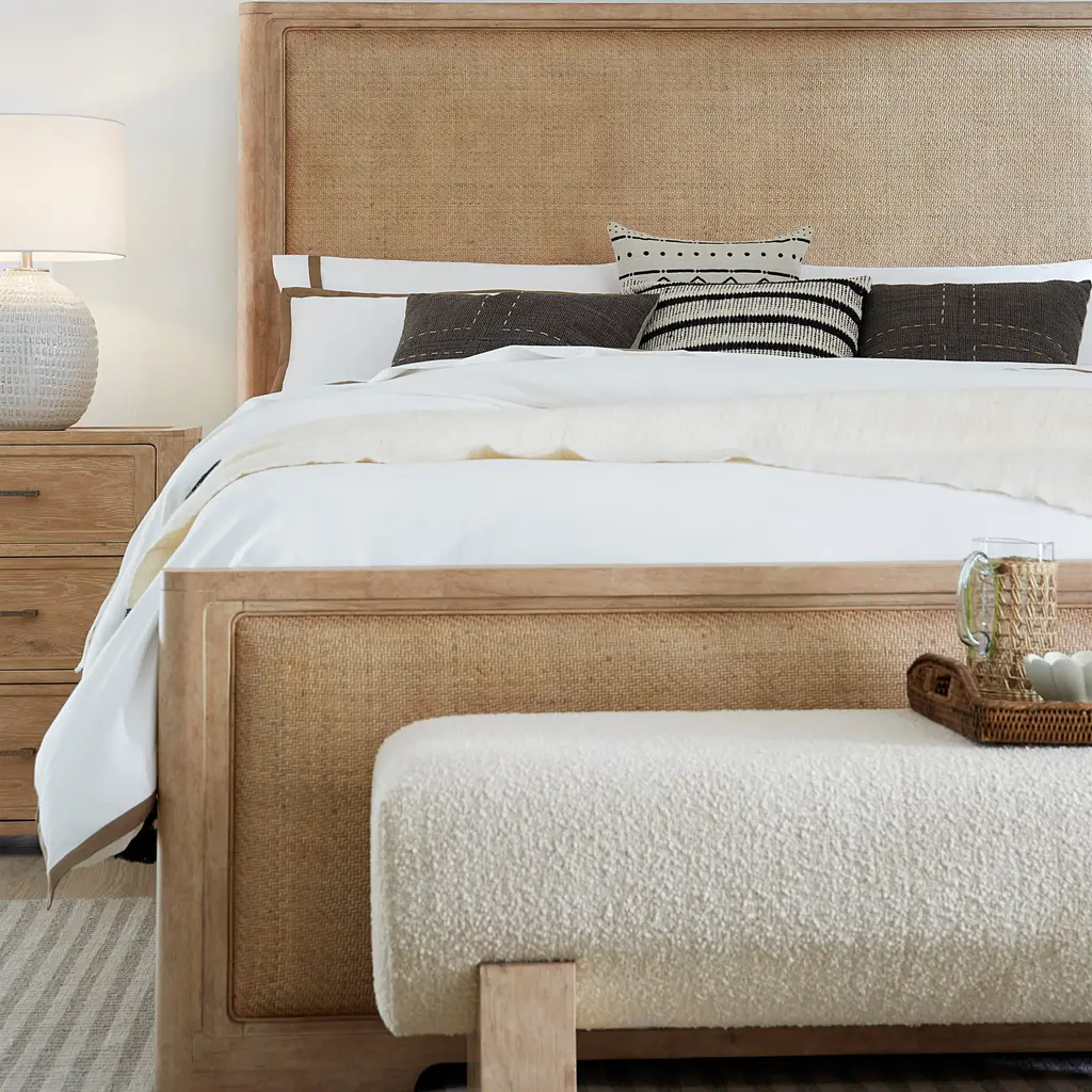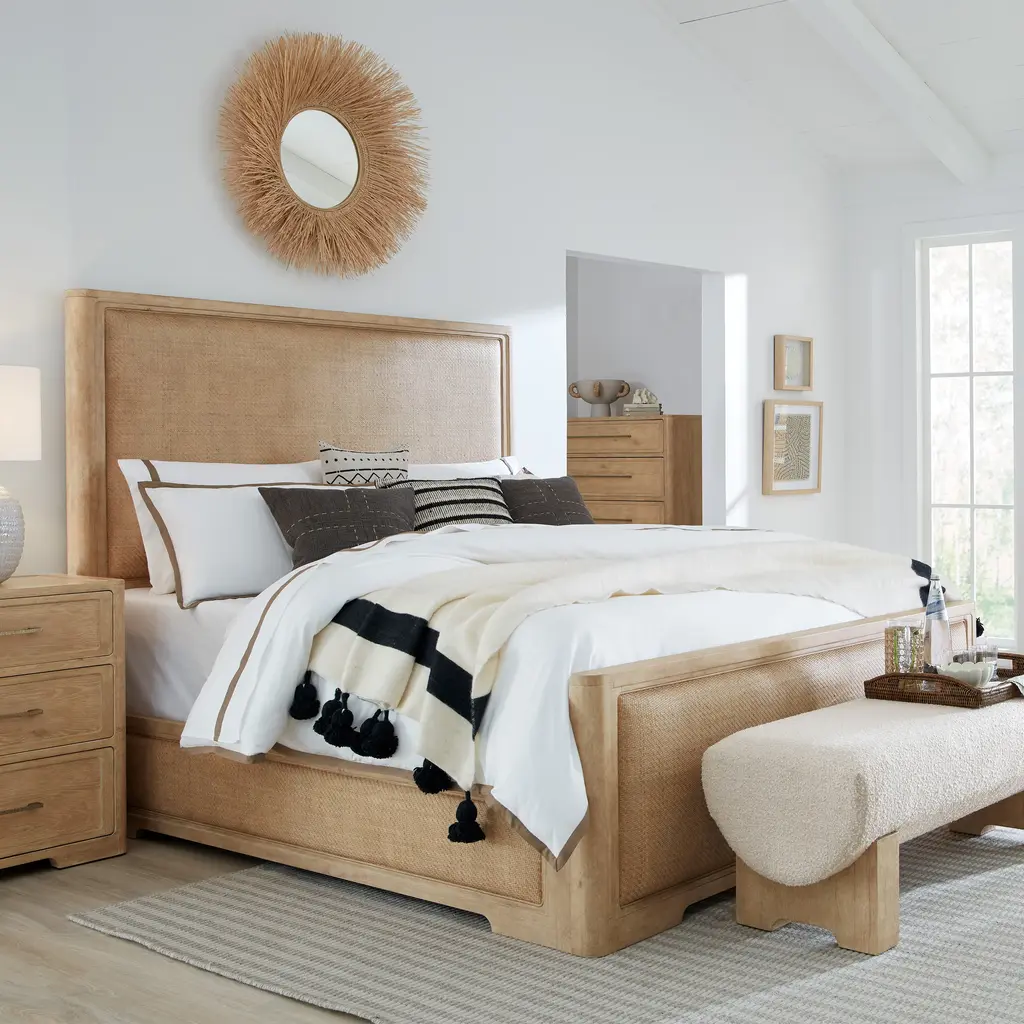 Transport yourself to an island oasis with the Retreat Cane Panel Bed from Hooker Furniture. Its modern Zen design, crafted with wood and cane panel inserts, brings a serene atmosphere to any bedroom. Finished in a transparent sand-colored Dune, the unique wood grain is on full display, letting you drift off to bed in the curated look of your calm, stylish sleep space. Highlights