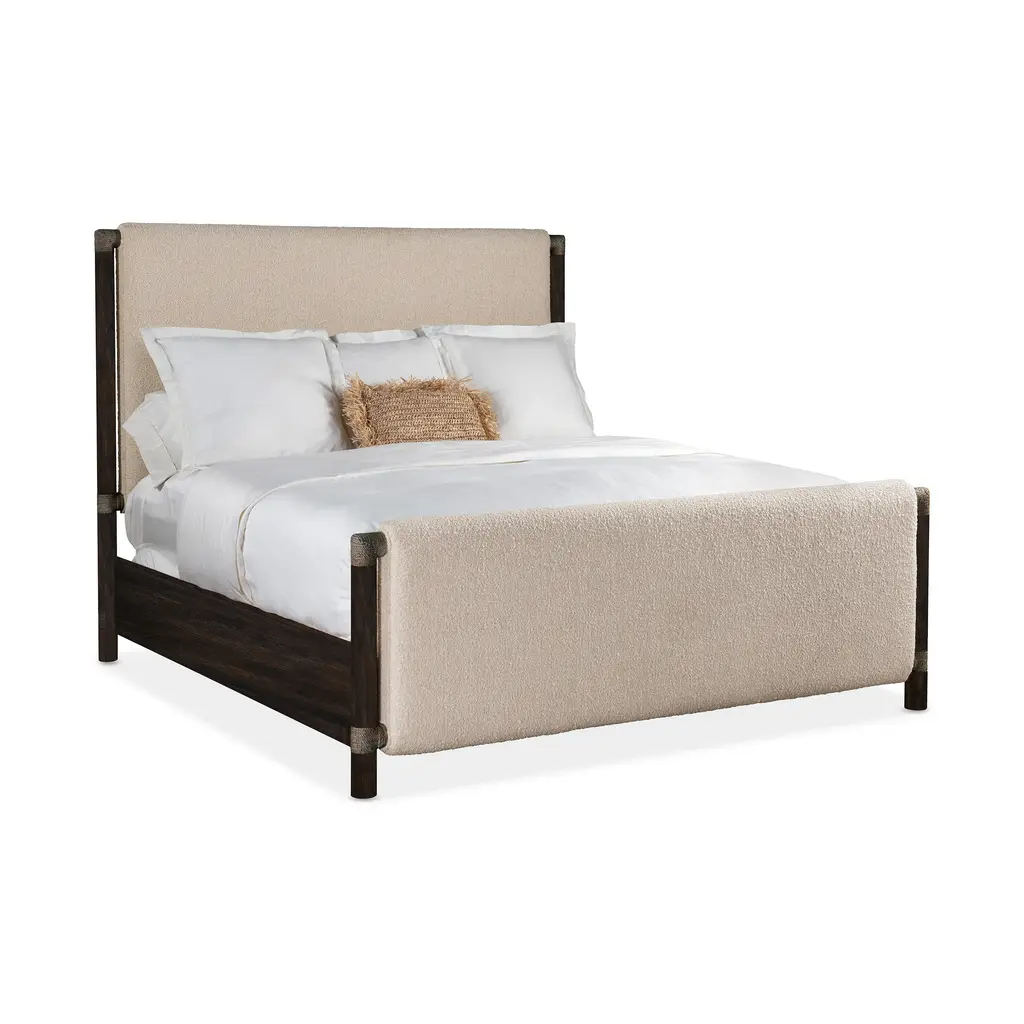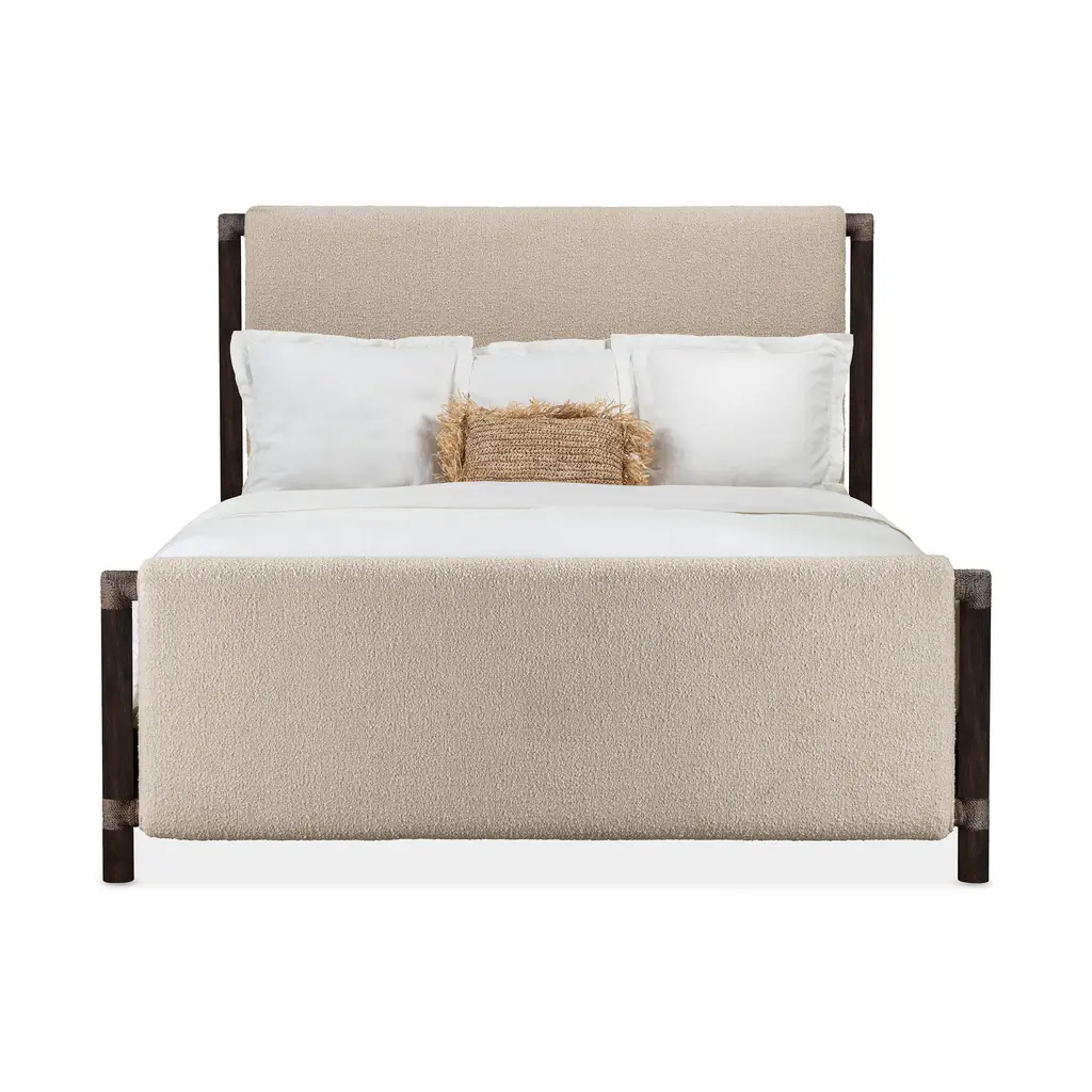 Escape to a serene oasis with Retreat Upholstered Panel Bed from Hooker Furniture. This beautifully crafted bed showcases the unique grain patterns of flat cut cathedral oak veneers, highlighting your choice of two transparent finishes: Dune and Black Sand. The woven cane panel bed and spa-inspired case pieces create a modern and relaxing atmosphere. Highlights
