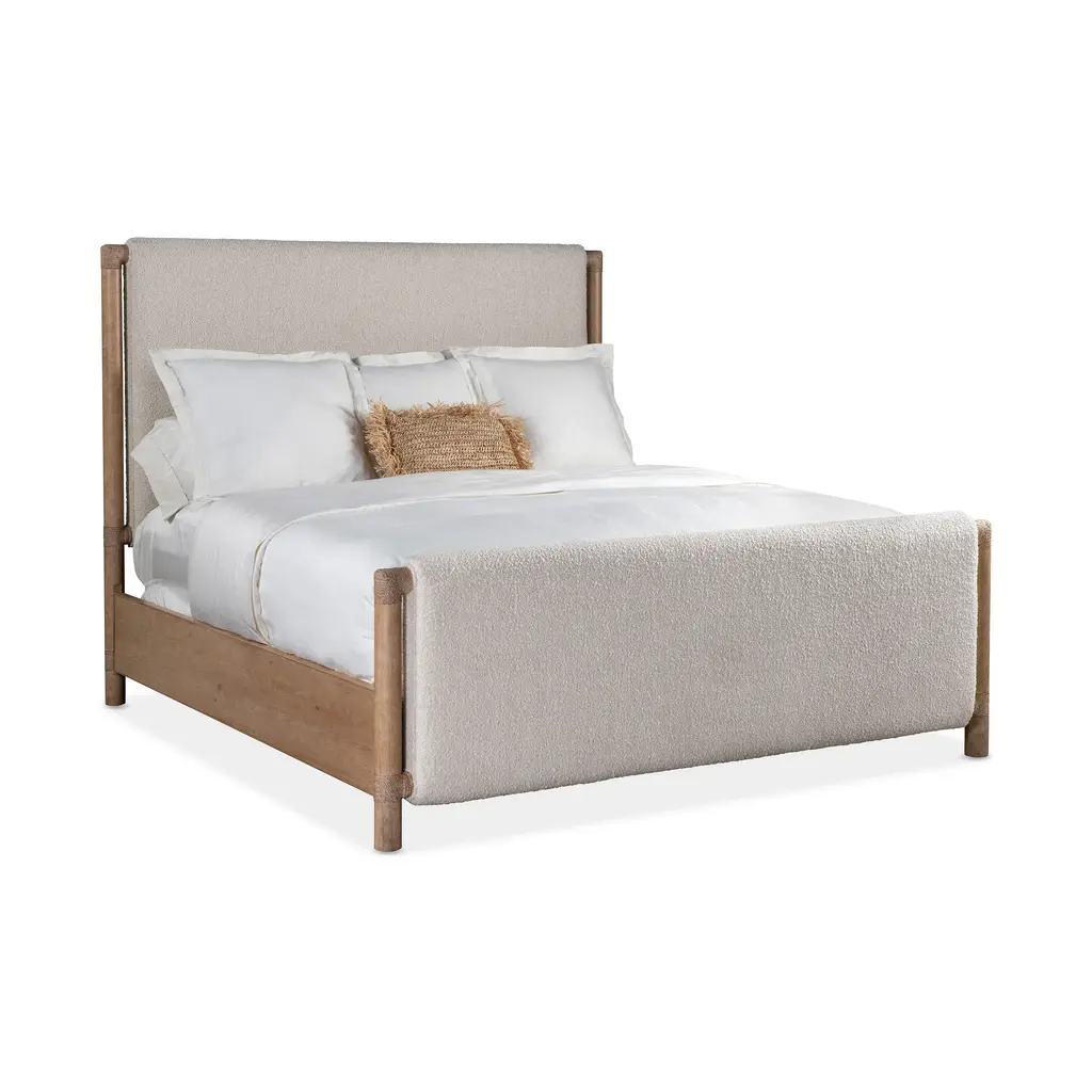 Escape to a serene oasis with Retreat Upholstered Panel Bed from Hooker Furniture. This beautifully crafted bed showcases the unique grain patterns of flat cut cathedral oak veneers, highlighting your choice of two transparent finishes: Dune and Black Sand. The woven cane panel bed and spa-inspired case pieces create a modern and relaxing atmosphere. Highlights