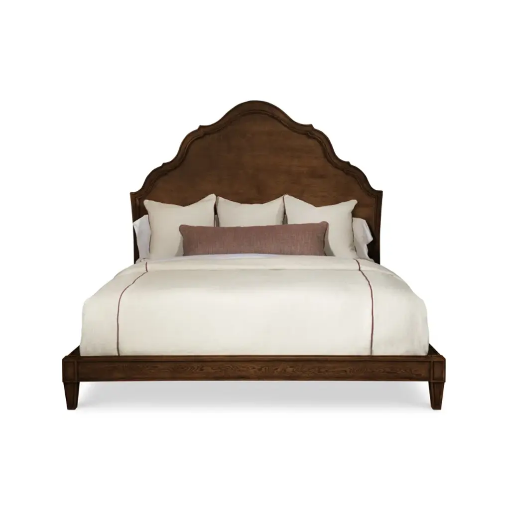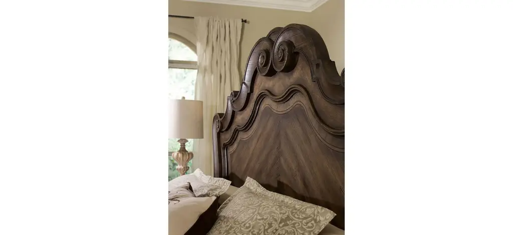 A chevron veneer pattern inspired by a French antique gives a striking appearance to the Rhapsody California King panel bed. Adding to the drama is the elaborately carved headboard, adorned with a grand interpretation of the recurring scroll motif. The final exquisite touch to this focal point piece is the walnut-colored finish inspired by the natural yet rustic nature of reclaimed woods in beautiful patinas. The pecan veneers create character through variations of color tones in the wood, knots and striate. Includes headboard, footboard and rails.
