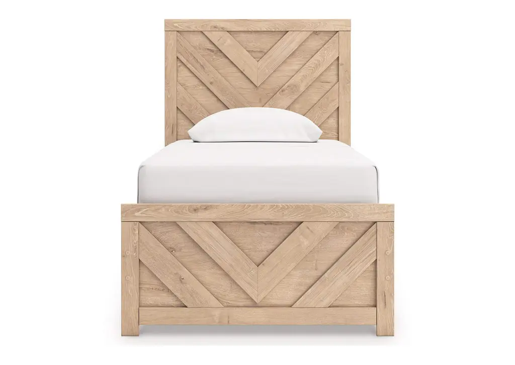 The Sanginlane twin panel bed brings a touch of modern farmhouse charm to your home. Its light oak finish and clean lines have a fresh, airy feel, effortlessly creating an inviting atmosphere for a restful night’s sleep. A striking chevron pattern adds texture and visual interest for a fresh take on country living. Weight 99.000 lbs. (44.55kgs.)