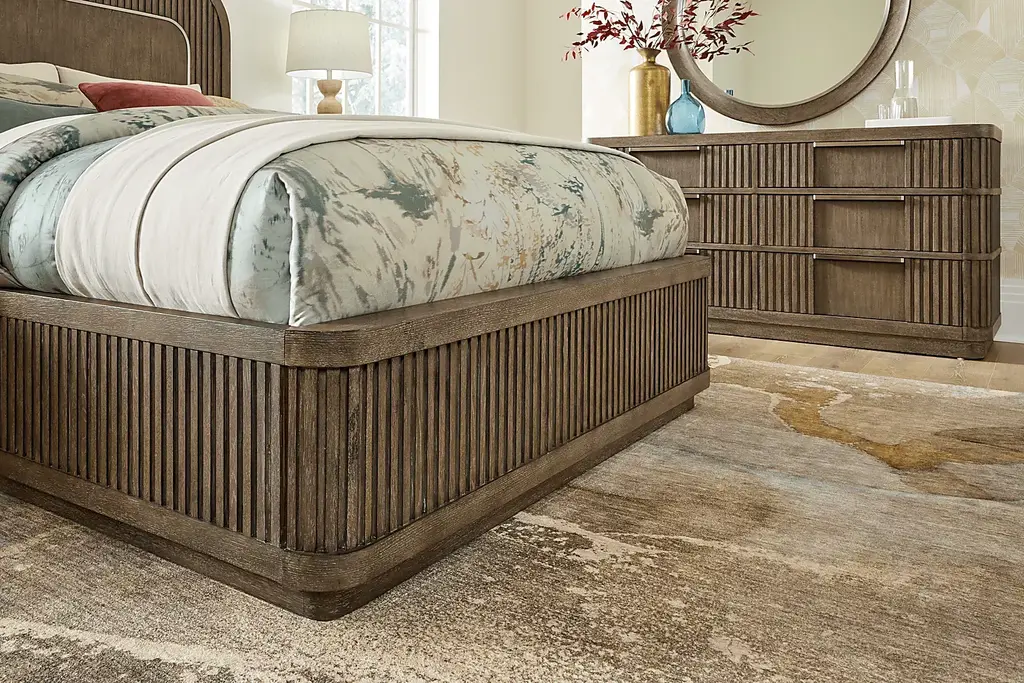 Boldly confident with a gentle touch of softness, the Sausalito bed from Drew & Jonathan punctuates the day with a quiet double-take at its red carpet-worthy looks. A commanding headboard crafted with oak veneers in a brown finish is trimmed with an outer arch of stunning reeded details. The footboard echoes the carved design and stands on a plinth-style foot. Mattress and foundation (if required) sold separately.