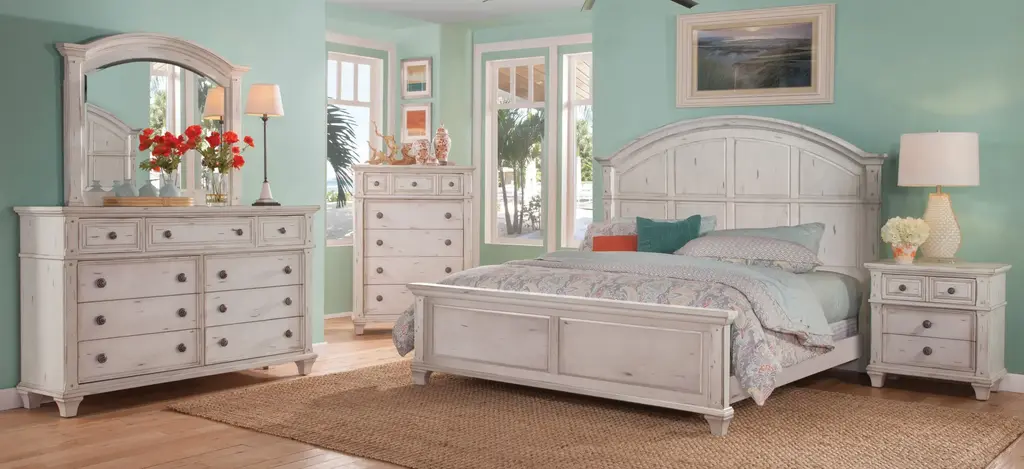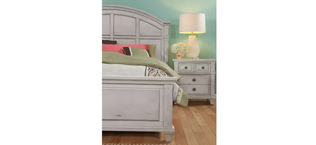 Sedona collection has authentic details such as wooden pegs on the case pieces and bed and wooden knobs with bronze-finished metal inserts. Crafted of Hardwood solids and Mahogany veneers, the collection features a chic Cobblestone White finish with gray undertones, making it a perfect choice for coastal, cottage and farmhouse interiors.