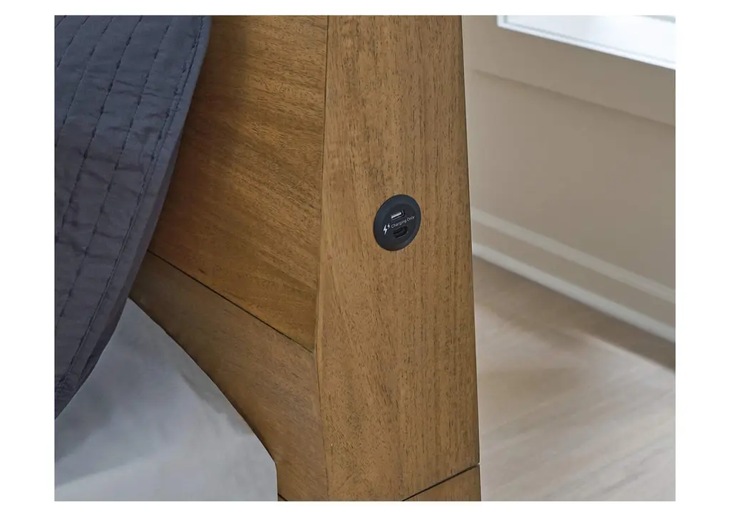 If you appreciate minimalistic style, the Sherbana king panel bed is the ideal option. Its soft and simple finish has a laid-back sensibility, blending relaxed contemporary design with a trendy allure. The beautiful layback headboard features convenient USB charging ports that are ready to power up your electronics. What a delightful addition to your casual-chic decor. Weight 301.000 lbs. (135.45kgs.)