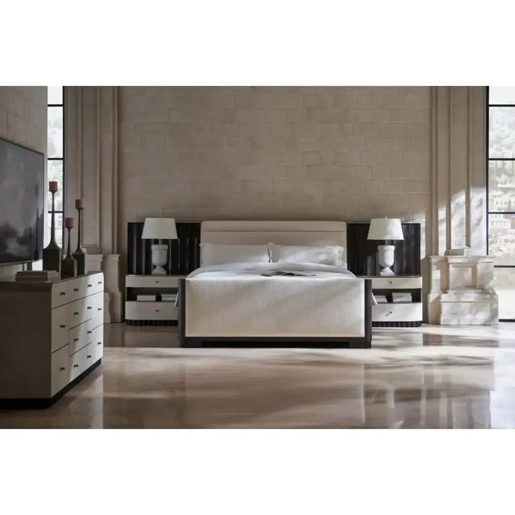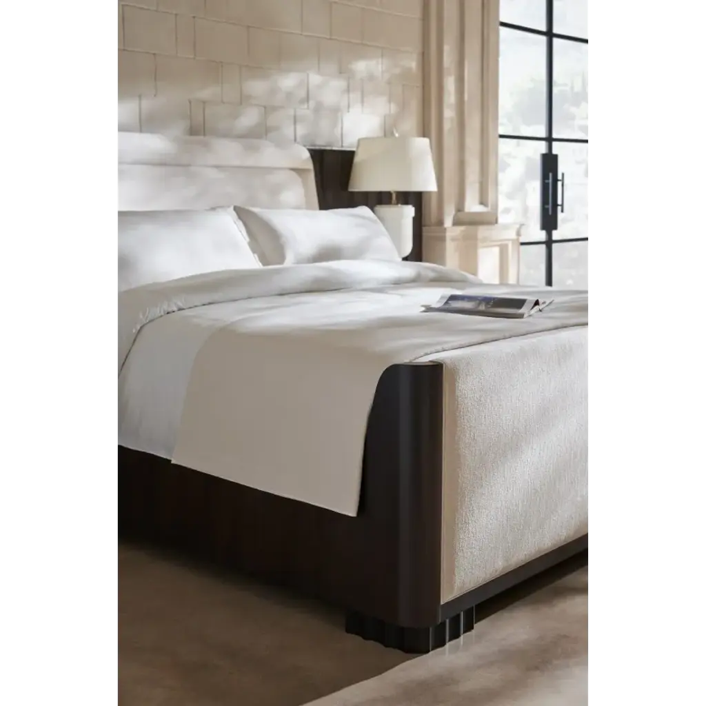 Inspired by neoclassical architecture, this contemporized sleigh bed makes a prominent statement with overscaled fluted wing panels, finished in a mix of Otter and Dark Chocolate. Features a comfortably canted headboard and clean-lined footboard, dressed in a faux slub silk that mimics microfluting found on other pieces in our collection. Sold as a set of two, wing panels are designed with cord access along the bottom corners for added function.
