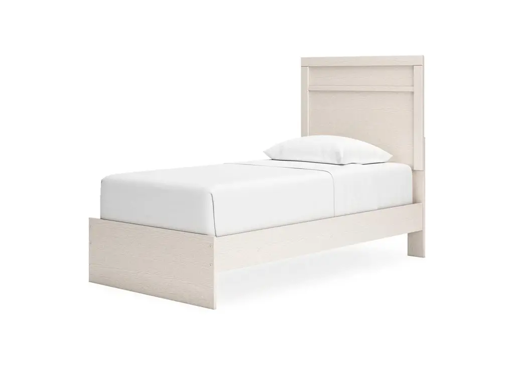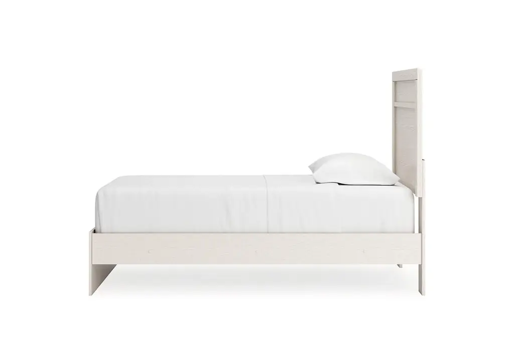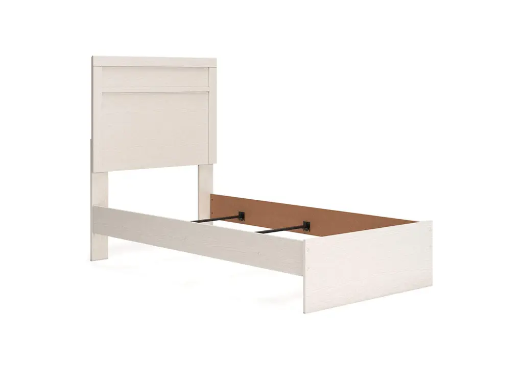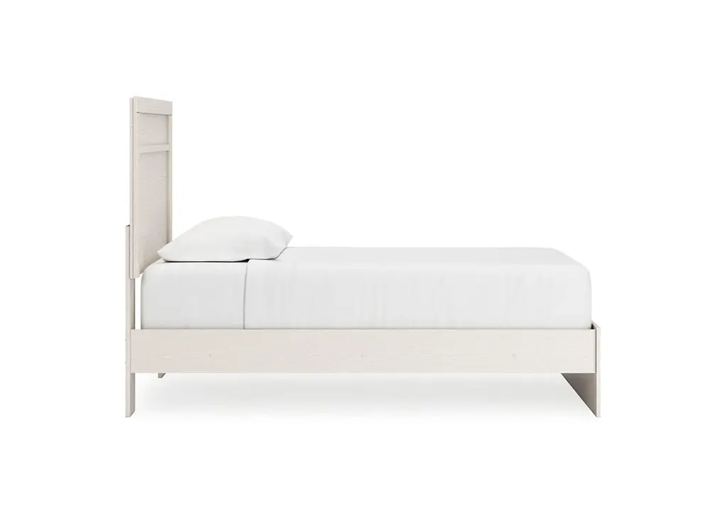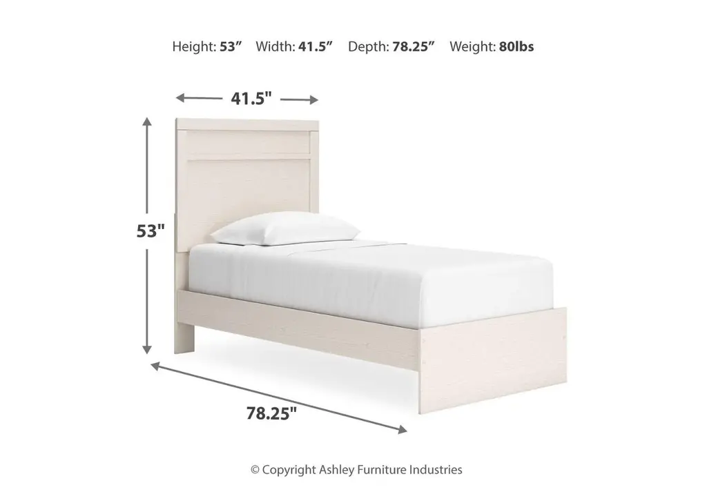 With its clean-lined look and modern attitude, the Stelsie panel bed is a fresh style awakening. A crisp, white hue over subtle replicated wood grain easily complements other furniture finishes. Its simple, unadorned profile is given depth and dimension with the addition of plank-style moulding on the headboard—proof that beauty lies in the details. Weight 80.000 lbs. (36kgs.)