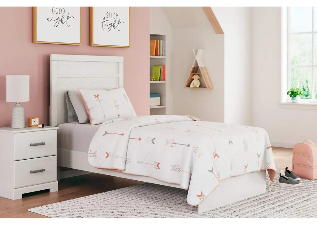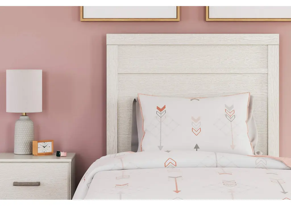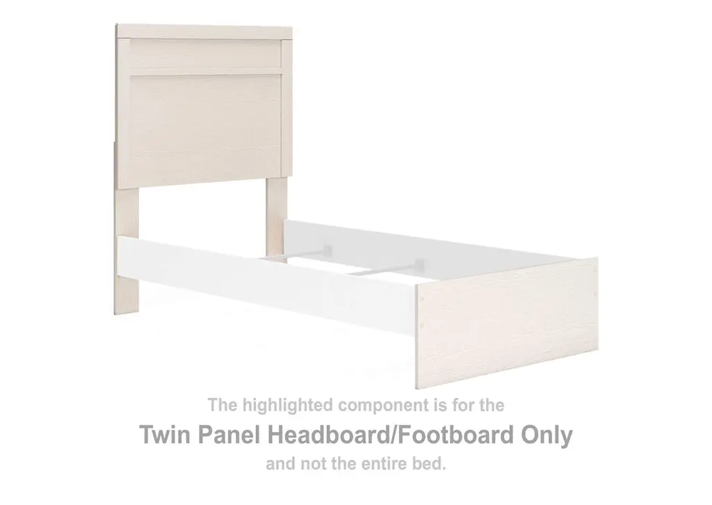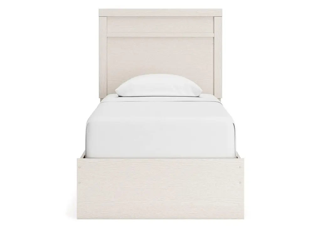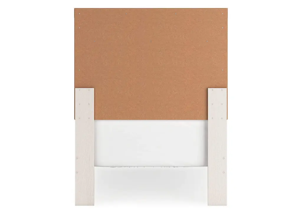 With its clean-lined look and modern attitude, the Stelsie panel bed is a fresh style awakening. A crisp, white hue over subtle replicated wood grain easily complements other furniture finishes. Its simple, unadorned profile is given depth and dimension with the addition of plank-style moulding on the headboard—proof that beauty lies in the details. Weight 80.000 lbs. (36kgs.)