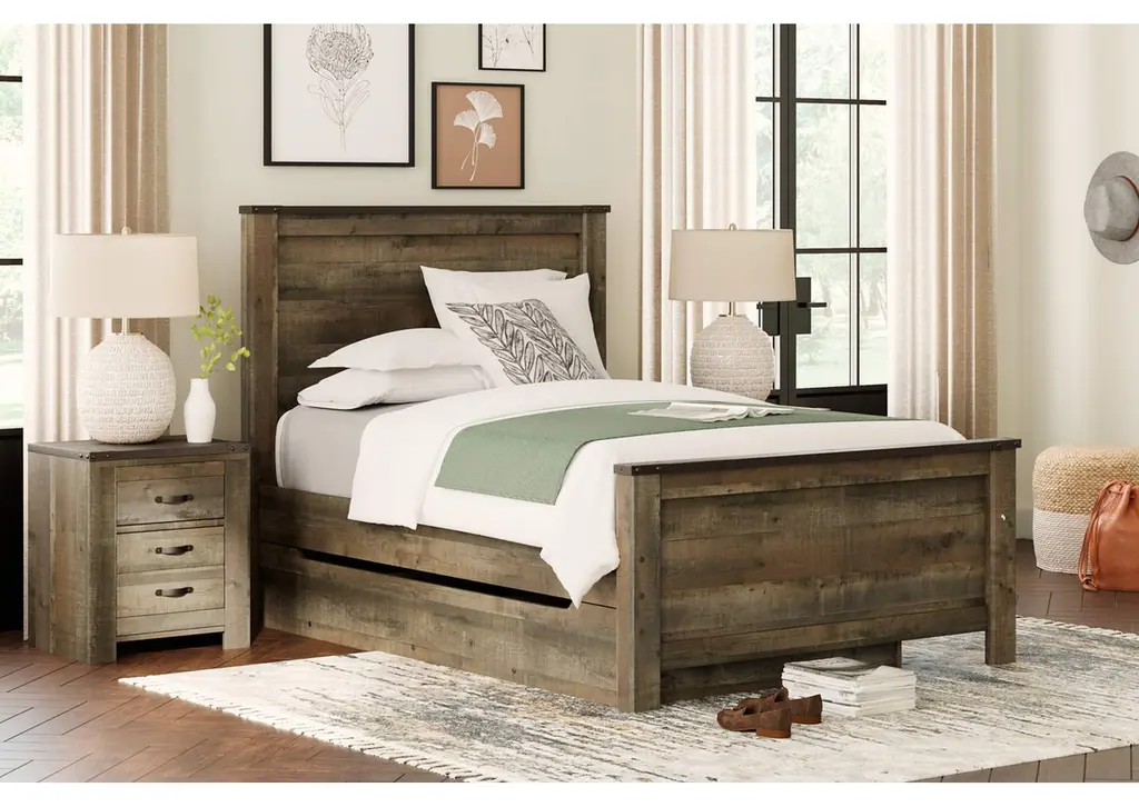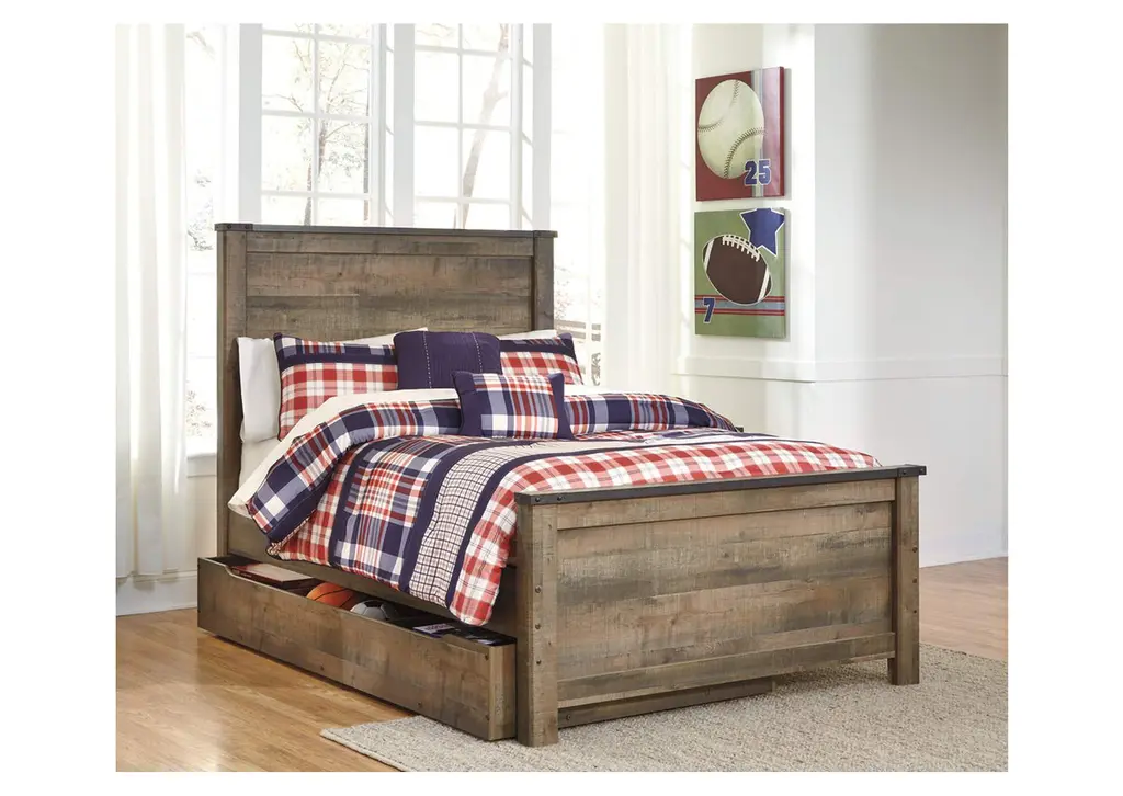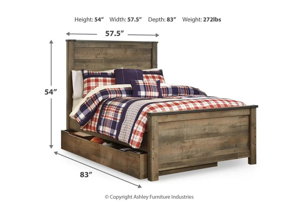 If you love country living, the Trinell full panel bed with storage matches your authenticity. Its rustic finish, plank-style details and nailhead trim pay homage to reclaimed barn wood, making for a chic look loaded with charm. The under bed storage unit includes two dividers to accommodate everything from toys and games to books and bedding. Mattress and foundation/box spring available, sold separately. Weight 275.000 lbs. (123.75kgs.)