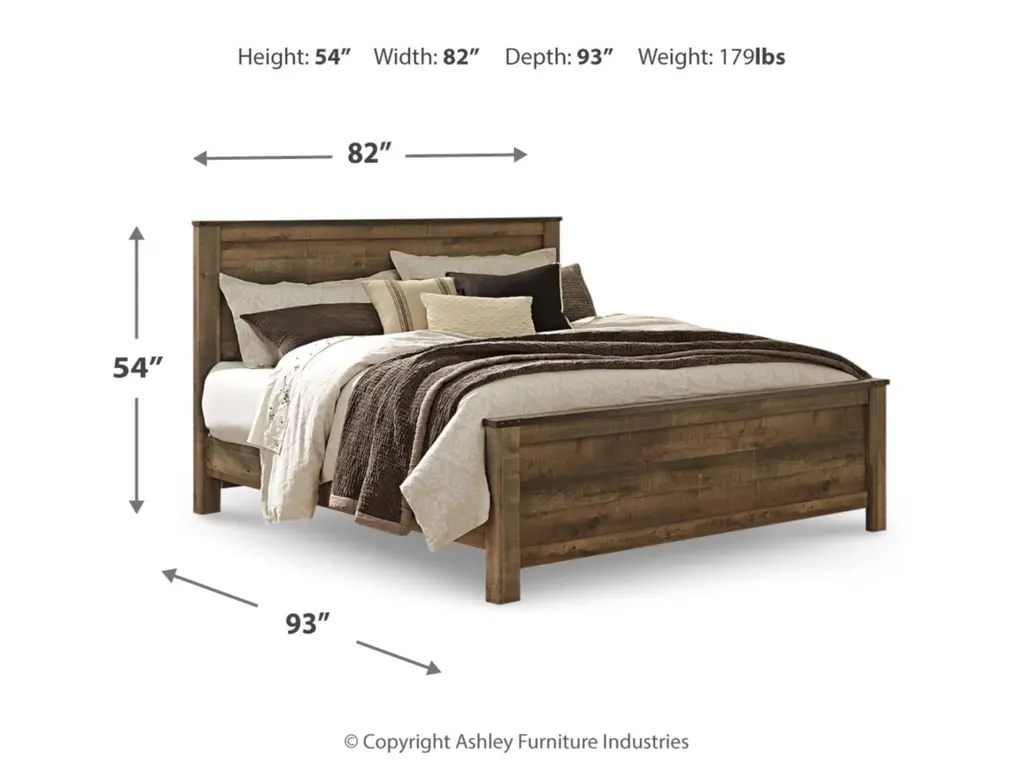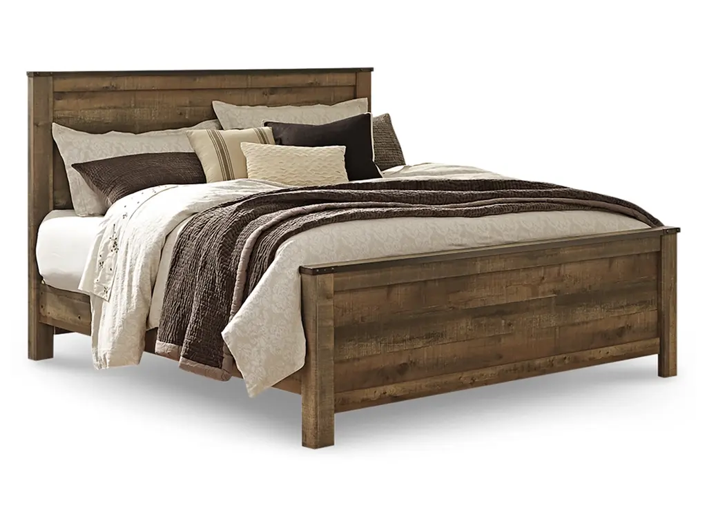If you love country living, the Trinell king panel bed matches your authenticity. Its rustic finish, plank-style details and nailhead trim pay homage to reclaimed barn wood, making for a chic look loaded with charm. Mattress and foundation/box spring available, sold separately.