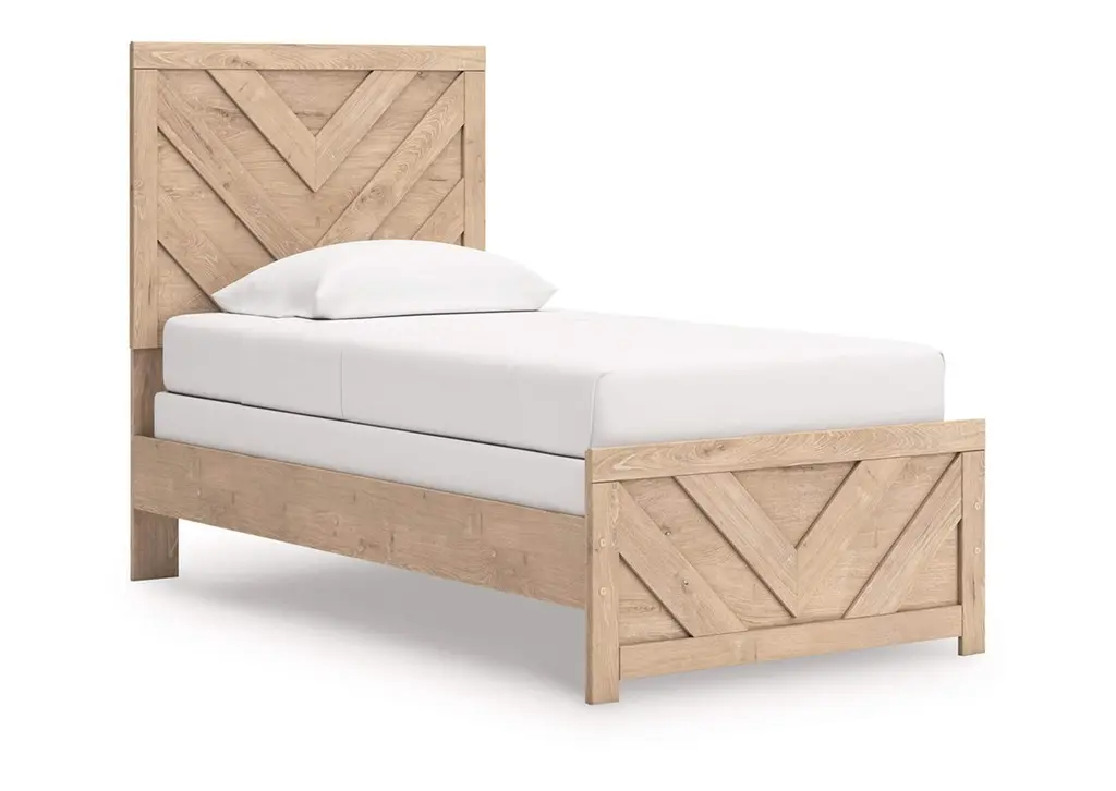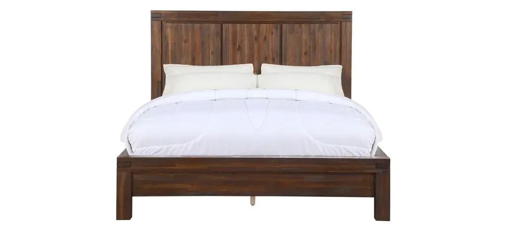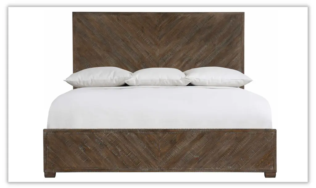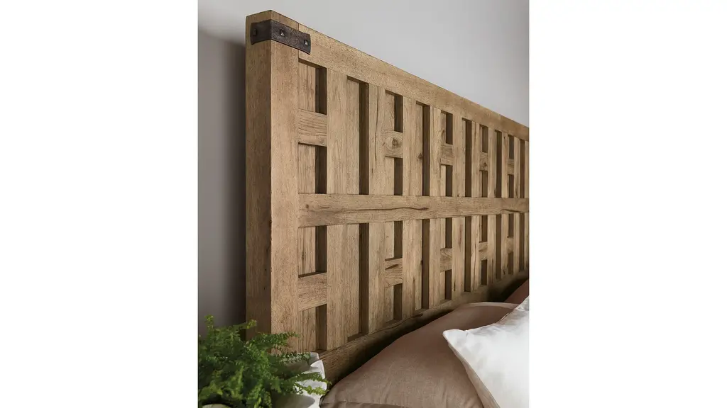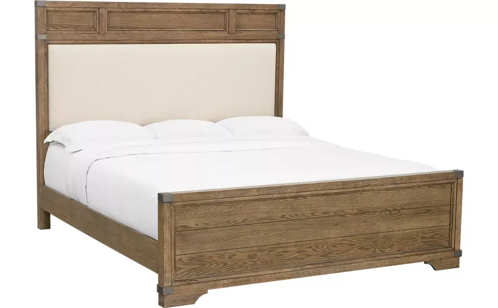 Inspired by California wine country and influenced by the craftsman architecture of the region, the stunning Vineyard Row Panel Bed has a cutout fretwork design on the headboard and footboard and rustic, hammered metal accents. It is crafted of pecky hickory veneers and finished in the light-and-airy sonoma. Includes the headboard, footboard and rails. The headboard can be used alone.