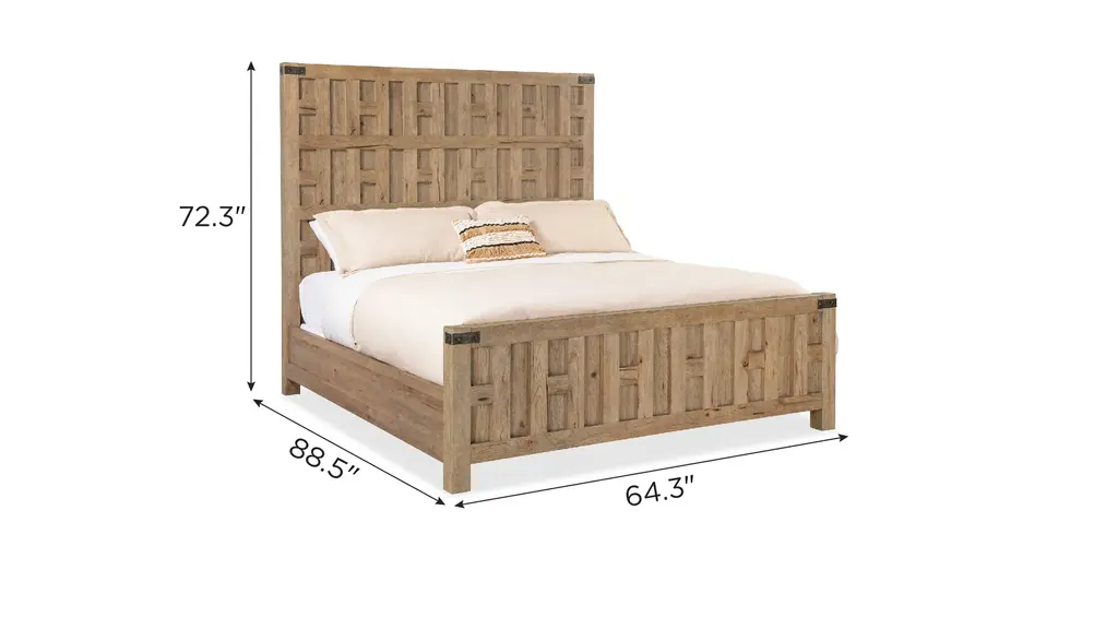 Inspired by California wine country and influenced by the craftsman architecture of the region, the stunning Vineyard Row Panel Bed has a cutout fretwork design on the headboard and footboard and rustic, hammered metal accents. It is crafted of pecky hickory veneers and finished in the light-and-airy sonoma. Includes the headboard, footboard and rails. The headboard can be used alone.