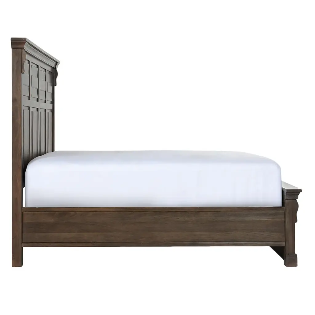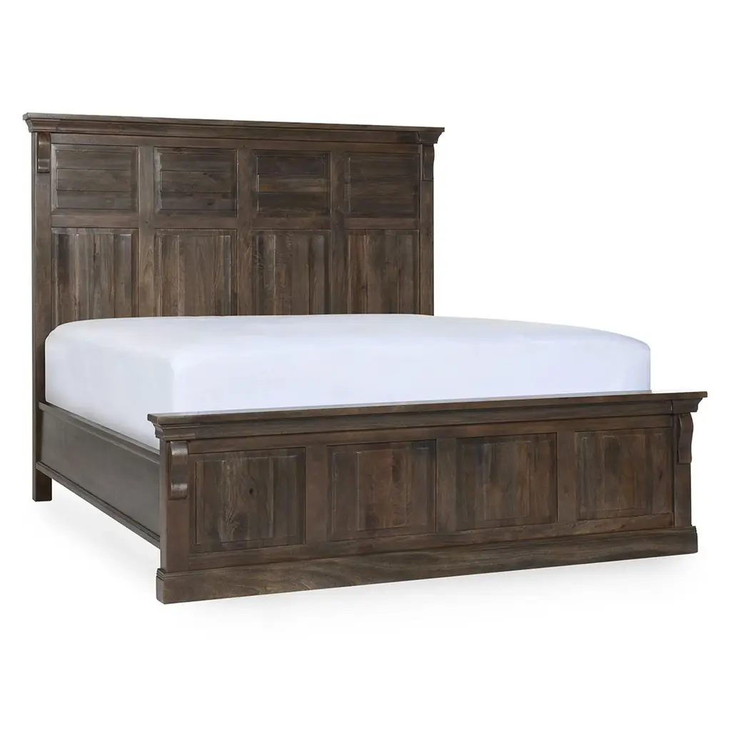 Solid mango wood queen sized bed frame with rich walnut stain finish. Classic carved panel design headboard and footboard. Each may vary in exact tones, grain, and natural imperfections. This bed frame weighs approx. 260 lbs.