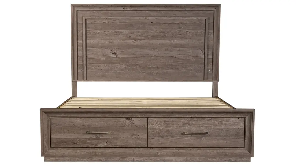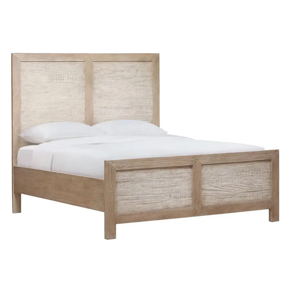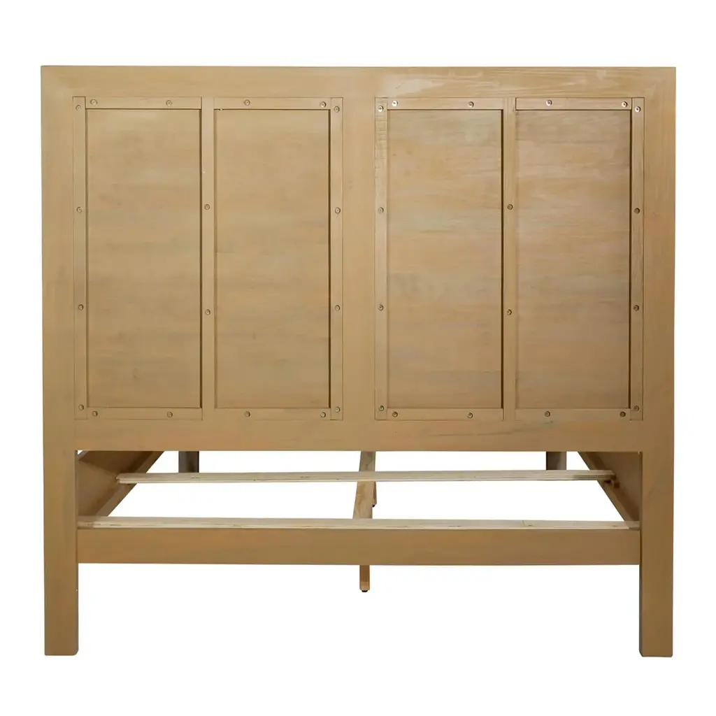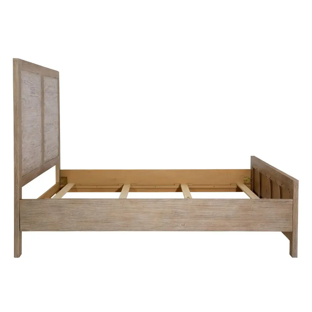 Solid pine wood queen sized bed frame with beautiful rustic washed finish. Each will have variations in exact wood tones/finish and natural imperfections. Weighs approx. 130 lbs.
