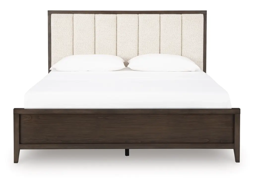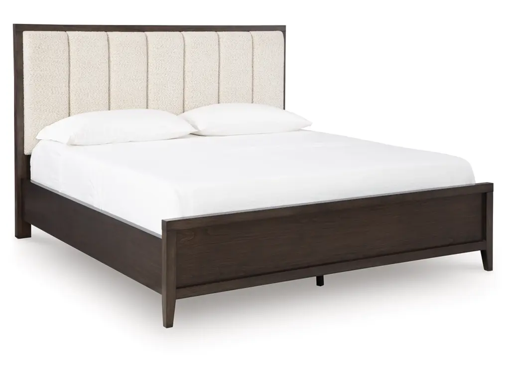 Create your ideal sanctuary with the Westonfort California king upholstered panel bed. The dark espresso brown finish and clean lines are undeniably contemporary, but the attitude is more relaxed—our interpretation of metropolitan casual style. Its simple silhouette frames a channeled headboard cushion wrapped in textured polyester fabric for subtle dimension. Tapered legs beautifully elevate the mood. Whether you're starting your day or winding down, this stylish bed provides the perfect backdrop.