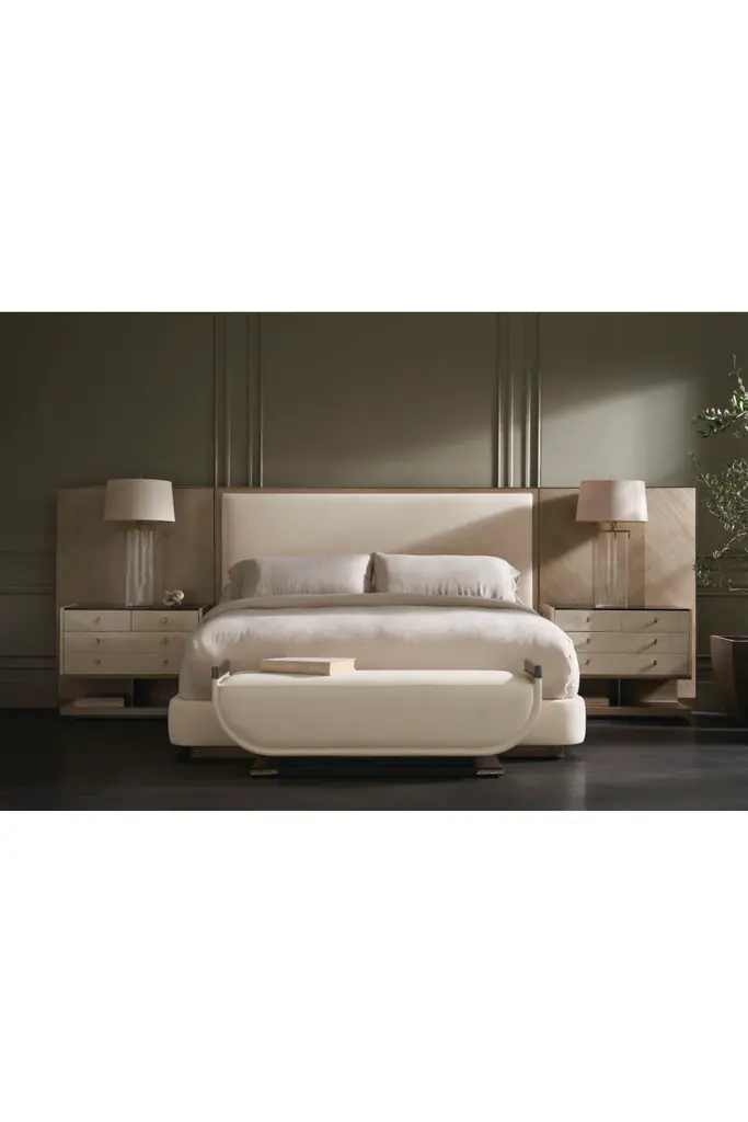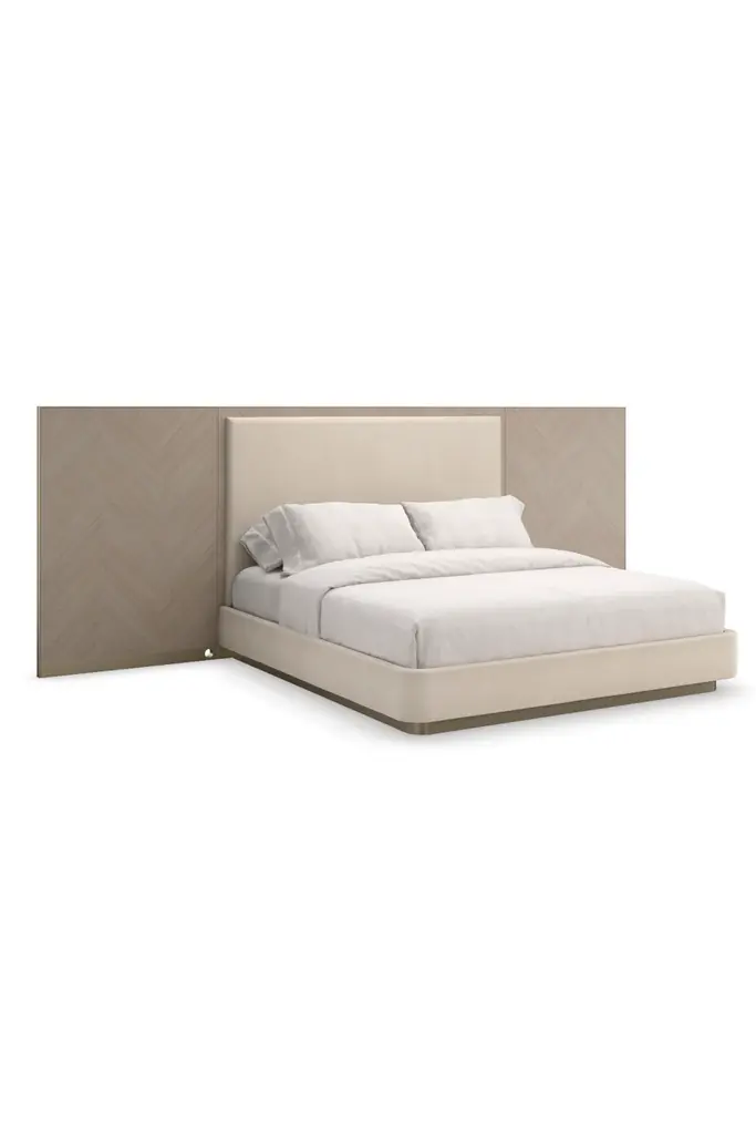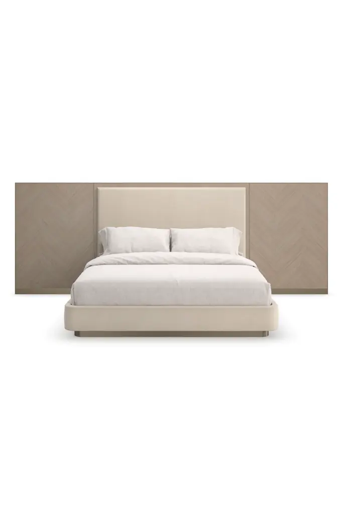 A storied collective of material and form, this classic bed introduces a calming neutral palette that is warm and inviting. Features paneled wings in Koto veneers with a Chevron pattern inspired by early Greek motifs, framing a parsons-style headboard dressed in a soft yet durable wool-like flannel. A metal spline in Brushed Gold lends separation and a hint of shimmer. Seemingly floating on a Brushed Gold plinth base, its sophisticated silhouette brings effortless elegance to bedroom interiors and guest suites.Download Assembly Sheet