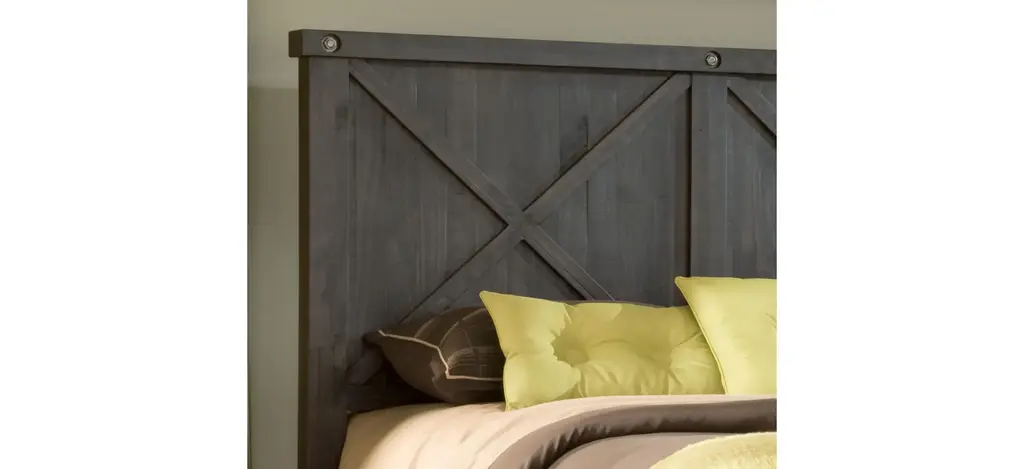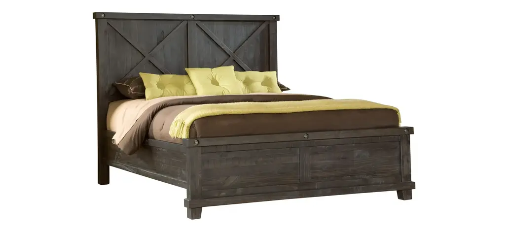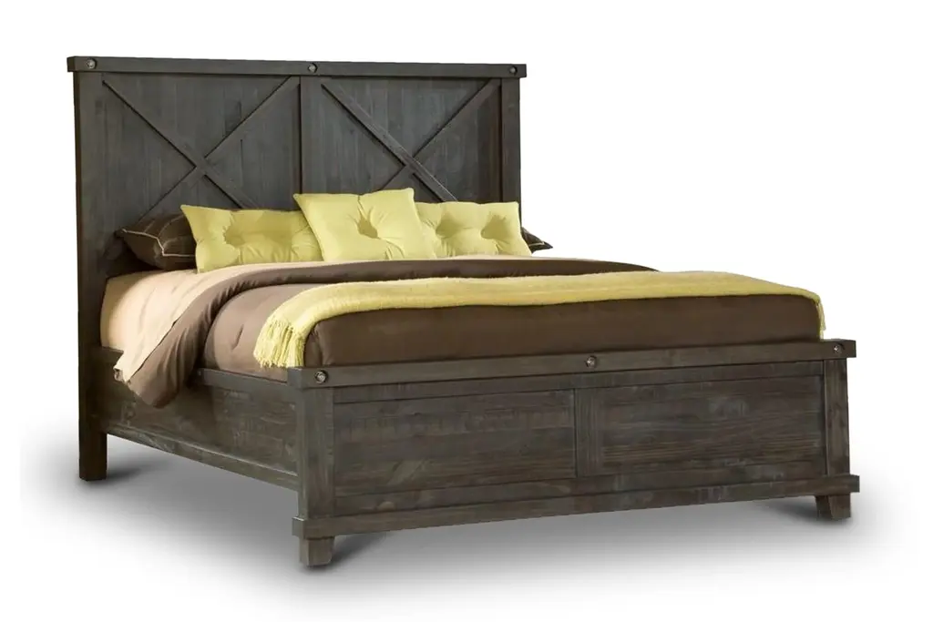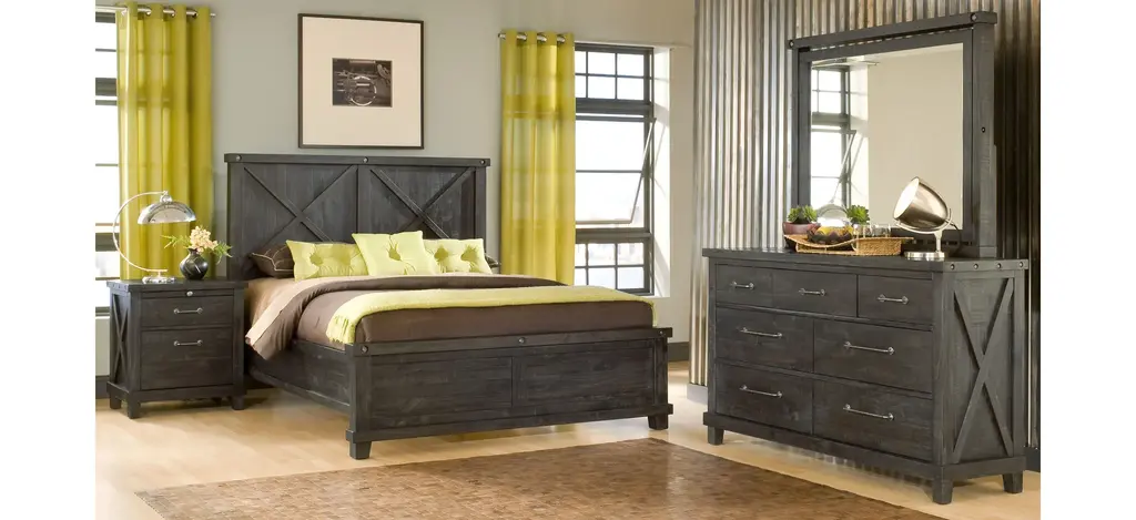 The Zabela bedroom recreates the improvised, utilitarian look of early 20th century factory furniture. Roughhewn planks bear the characteristic saw marks, dents, pits, and random knots of logs milled on the steam powered circular and sash saws of the era. A rustic black pine finish balances transparency and opacity to showcase these natural imperfections. Exposed bolts, hammered metal pulls, cross-braces and a tilt-style mirror evoke the ingenuity and earnestness that characterized the turn of the century. Modern conveniences include full extension ball bearing drawer glides for maximum storage capacity and smooth, efficient operation. Felt lined top drawers provide storage for valuables and the nightstand features a convenient a pull out tray. Choose from headboards with cross braced detailing or cushioned linen panels fashioned with nail head trim. Bed frames include 5 cross slats with center leg supports for use with a box spring and mattress. Crafted entirely from solid wood, the Zabela bedroom uses mortise and tenon frames, tongue and groove tops and frame and panel sides for strength and durability. 5-sided hardwood plywood drawer boxes with English dovetail corners are sanded and stained to match the exterior finish.