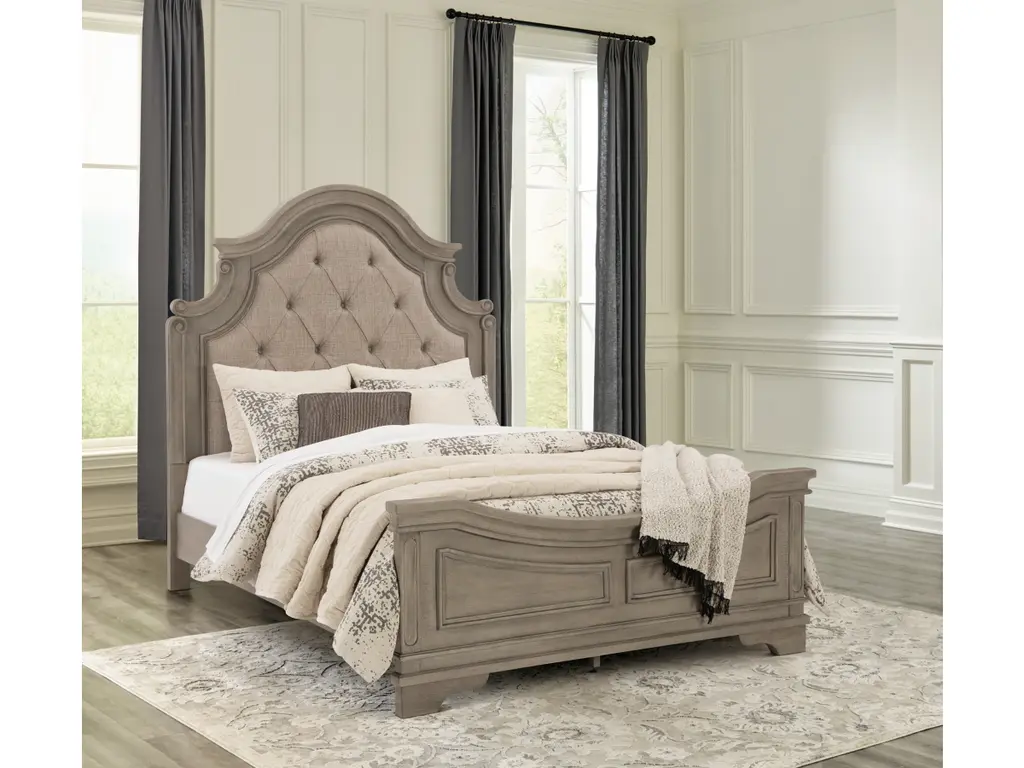 The Zuma upholstered bed blends sweeping curves on the crown of the headboard with a padded upholstered panel, paired with a platform footboard and side rails, and turned bun feet. The standard fabric, Seadrift, is a textural woven with the look of raw silk in shades of ivory, taupe, and mocha.