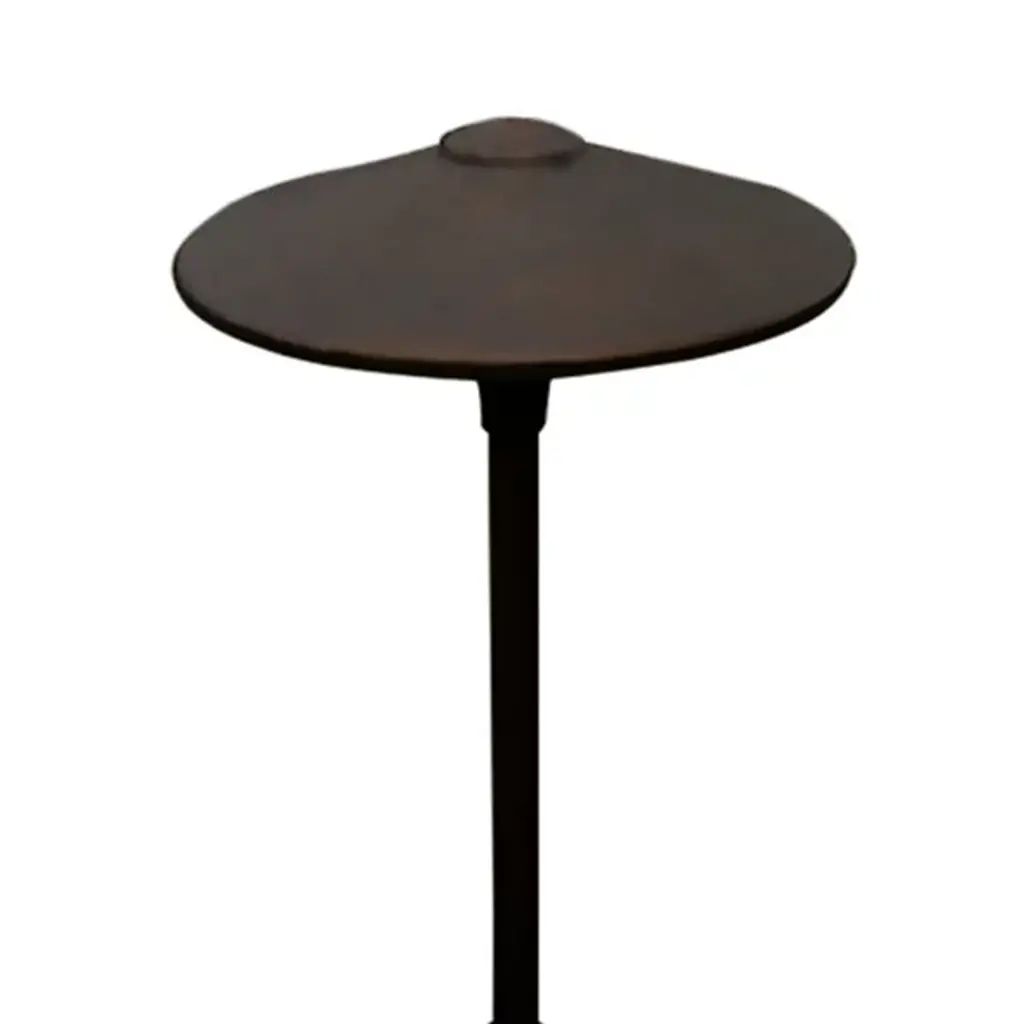 The 10 Inch Brass Panel LED China Hat Area Light by Focus Industries features a 4w LED panel light that is integrated into its heat sink hub. This long-lasting, energy-efficient light source is guided downwards by a 10 inch (diameter) China hat, preventing glare while also illuminating the surrounding area. Beneath the stem is a 9” ABS stake that mounts directly into the ground, allowing you to position the fixture according to your needs. Connects to a 12v landscaping electrical system. For use with magnetic transformers only (available separately).