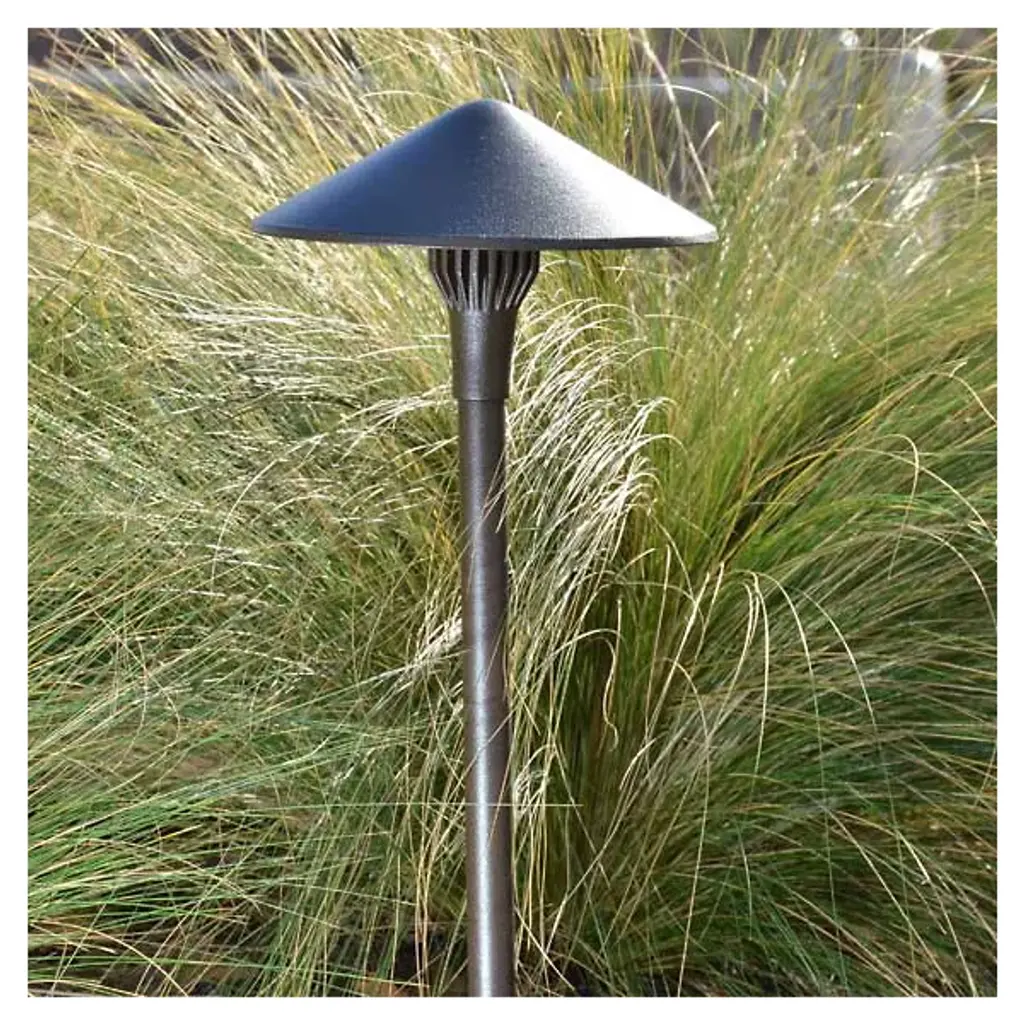 The 8 Inch Aluminum Panel LED China Hat Area Light by Focus Industries features a 4w LED panel light that is integrated into its heat sink hub. This long-lasting, energy-efficient light source is guided downwards by an 8 inch (diameter) China hat, preventing glare while also illuminating the surrounding area. Beneath the stem is a 9” ABS stake that mounts directly into the ground, allowing you to position the fixture according to your needs. Connects to a 12v landscaping electrical system. For use with magnetic transformers only (available separately).