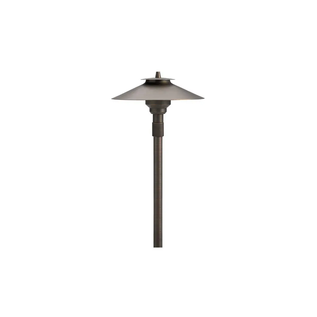 The Adjustable Hub Aluminum China Hat Area Light by Focus Industries embodies the inclined, multi-tiered rooftops prevalent in Asian architecture. While pleasing to the eye, the hat’s concave form effectively guides light downwards while its adjustable hub allows for the expansion of light coverage. In addition, its narrow stem has a 9” ABS stake that mounts directly into the ground, enabling you to position the fixture according to your needs. Connects to a 12v landscaping electrical system. Transformer is necessary but not included.