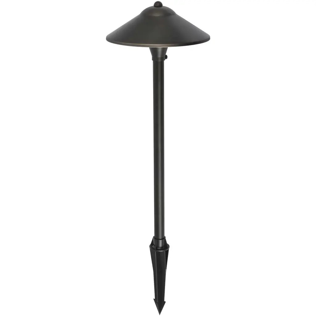 The Adjustable Hub Aluminum China Hat Area Light by Focus Industries embodies the inclined, multi-tiered rooftops prevalent in Asian architecture. While pleasing to the eye, the hat’s concave form effectively guides light downwards while its adjustable hub allows for the expansion of light coverage. In addition, its narrow stem has a 9” ABS stake that mounts directly into the ground, enabling you to position the fixture according to your needs. Connects to a 12v landscaping electrical system. Transformer is necessary but not included.