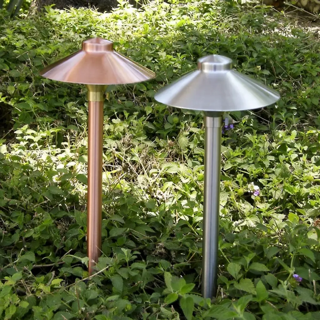 The Adjustable Hub Aluminum China Hat Area Light by Focus Industries embodies the inclined, multi-tiered rooftops prevalent in Asian architecture. While pleasing to the eye, the hat’s concave form effectively guides light downwards while its adjustable hub allows for the expansion of light coverage. In addition, its narrow stem has a 9” ABS stake that mounts directly into the ground, enabling you to position the fixture according to your needs. Connects to a 12v landscaping electrical system. Transformer is necessary but not included.