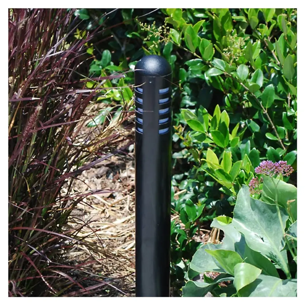 Simple, modern landscape lighting. The Aluminum Bollard Area Light by Focus Industries features a sleek, extruded aluminum body that is built to withstand the outdoor elements as well as mount directly into the ground. Light emanates from the upper portion of the cylinder, casting a perimeter of light that illuminates the surrounding area. Available in multiple finishes. Connects to a 12v landscaping electrical system. Transformer is necessary but not included.
