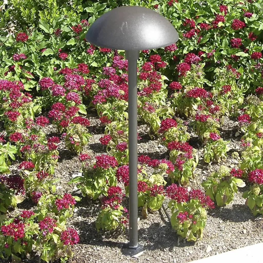 The Aluminum Mushroom Area Light by Focus Industries features a low-profile, mushroom-shaped hat the guides light downward to illuminate the surrounding area. Its narrow stem has a 9” ABS stake that mounts directly into the ground, allowing you to position the fixture according to your needs. Connects to a 12v landscaping electrical system. Transformer is necessary but not included.