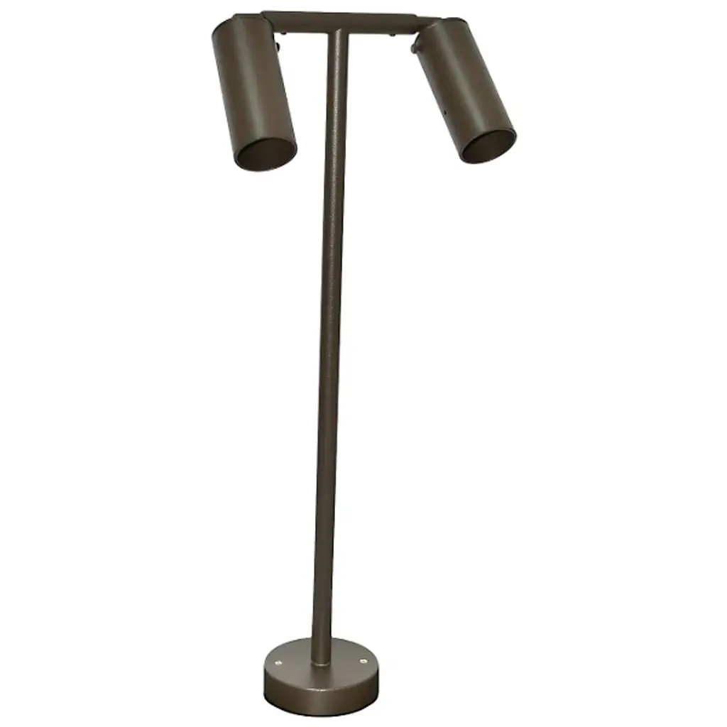 The Aluminum Two Head Path Light by Focus Industries gives you convenient control of your landscape lighting. Atop its aluminum stem sits two cast aluminum tubes (each containing light sources) that independently swivel and rotate up to 240°. Beneath the stem is a 9” ABS stake that mounts easily into the ground, allowing you to place the fixture where you need it most. Connects to a 12v landscaping electrical system. Transformer is necessary but not included.