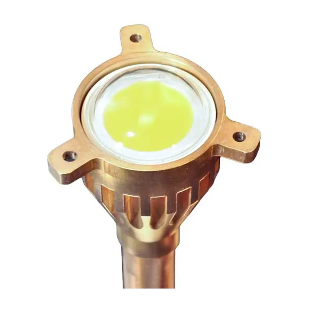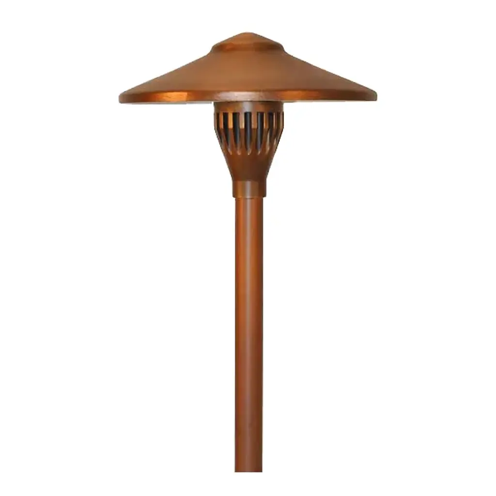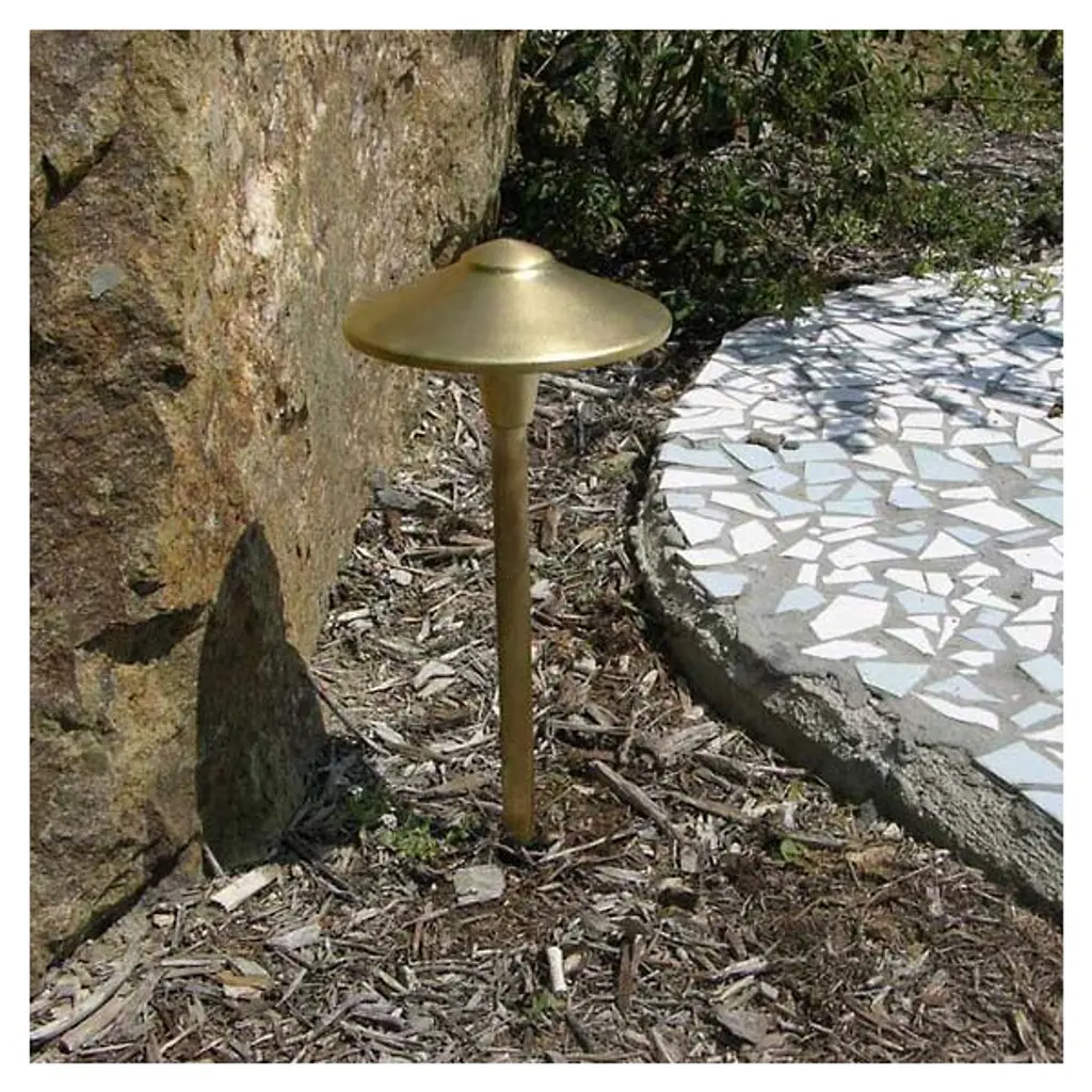 The Brass Panel LED China Hat Area Light by Focus Industries features a 4w LED panel light that is integrated into its heat sink hub. This long-lasting, energy-efficient light source is guided downwards by a 7.5 inch (diameter) China hat, preventing glare while also illuminating the surrounding area. Beneath the stem is a 9” ABS stake that mounts directly into the ground, allowing you to position the fixture according to your needs. Connects to a 12v landscaping electrical system. For use with magnetic transformers only (available separately).
