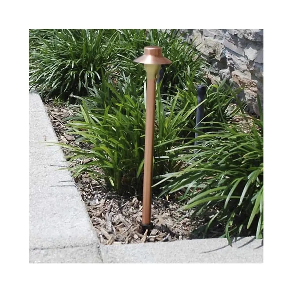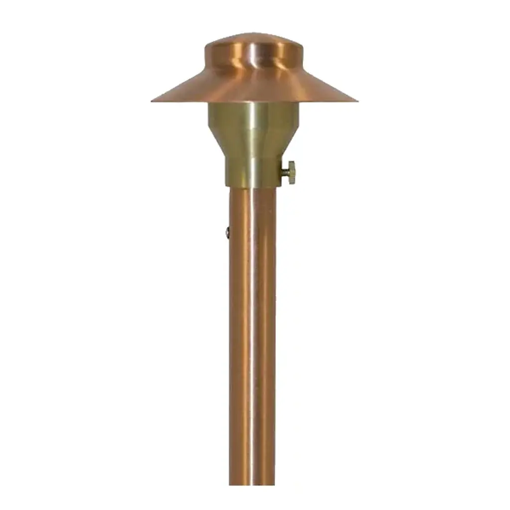 The Copper 3.5 Inch Area Light by Focus Industries is a smaller, low-profile version of the iconic China Hat Area Light. The fixture's concave form, though modestly-sized, helps guide light downwards while its adjustable hub allows for the expansion of light coverage. In addition, its narrow stem has a 9” ABS stake that mounts directly into the ground, enabling you to position the fixture according to your needs. Connects to a 12v landscaping electrical system. Transformer is necessary but not included.