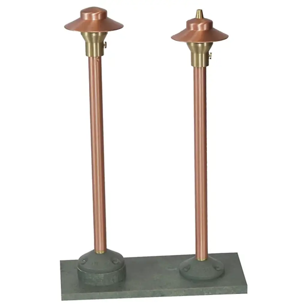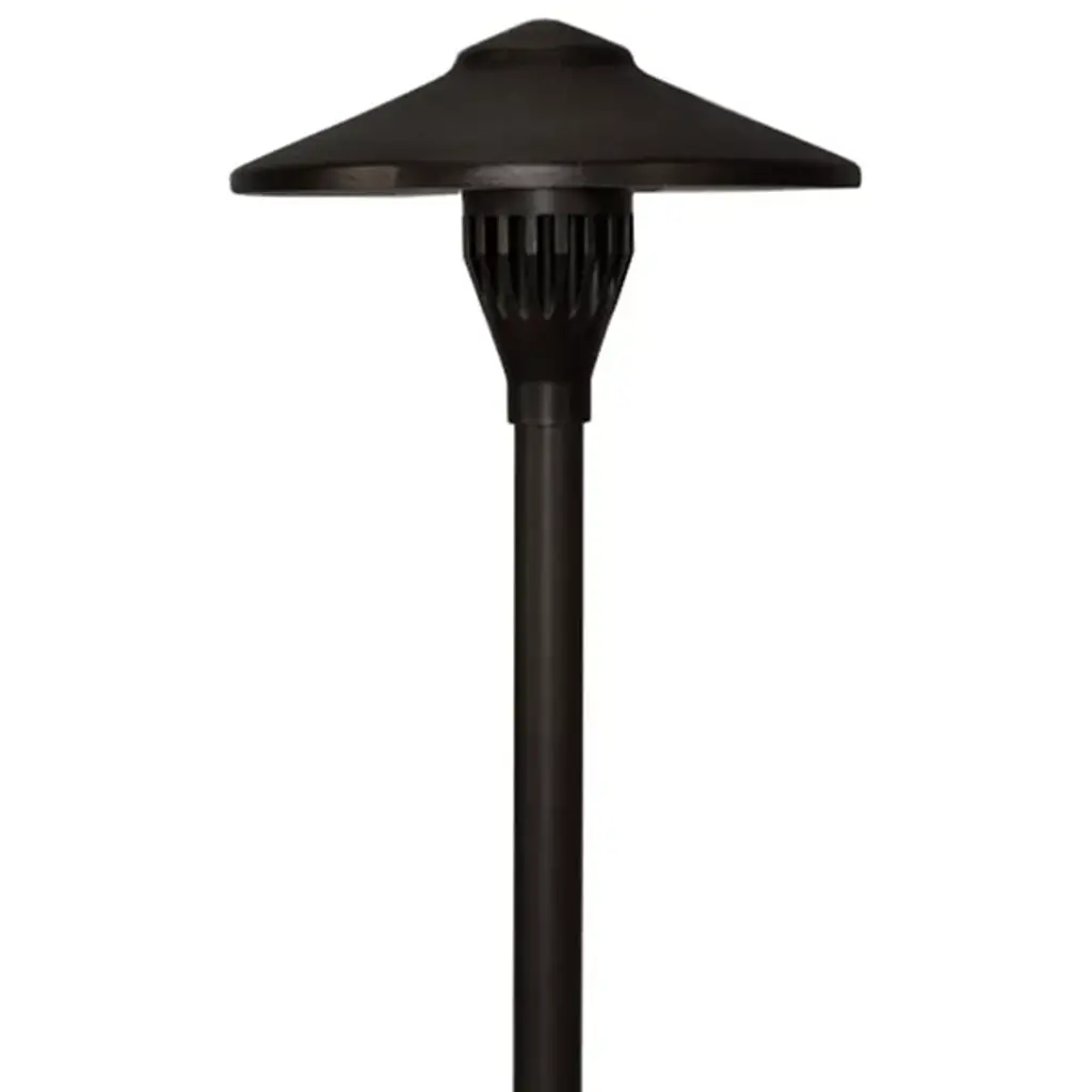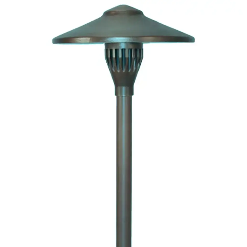 The Copper 3.5 Inch Area Light by Focus Industries is a smaller, low-profile version of the iconic China Hat Area Light. The fixture's concave form, though modestly-sized, helps guide light downwards while its adjustable hub allows for the expansion of light coverage. In addition, its narrow stem has a 9” ABS stake that mounts directly into the ground, enabling you to position the fixture according to your needs. Connects to a 12v landscaping electrical system. Transformer is necessary but not included.