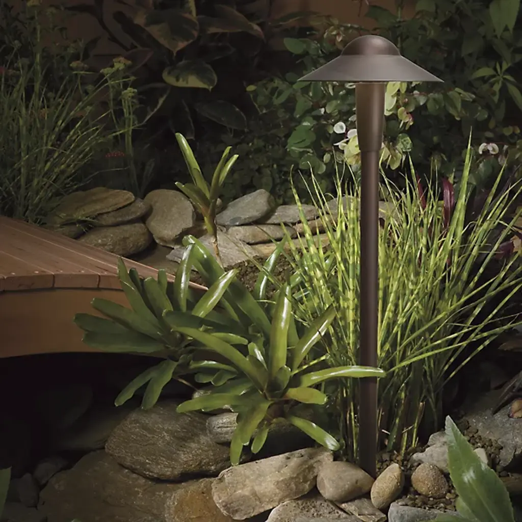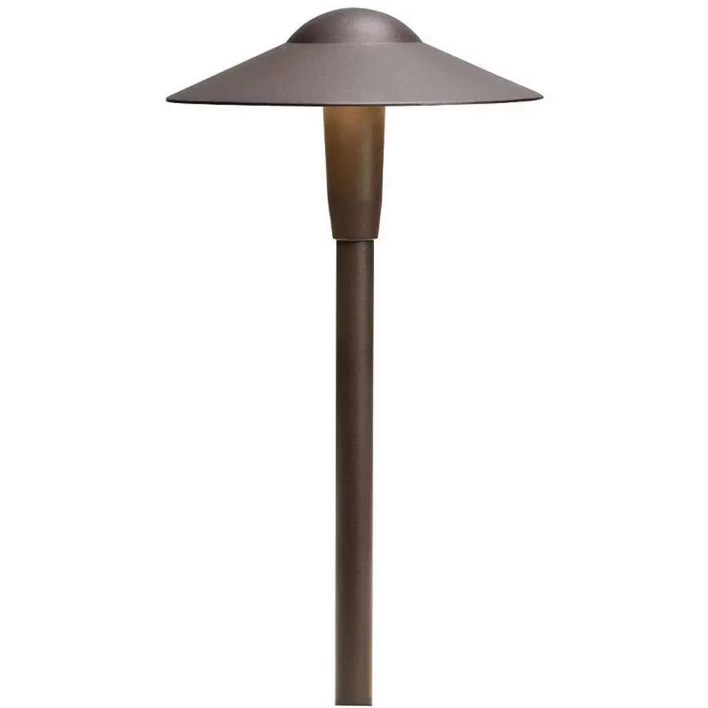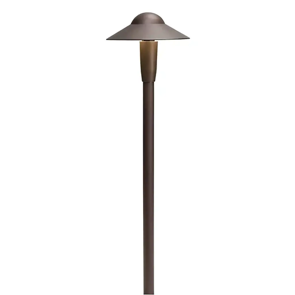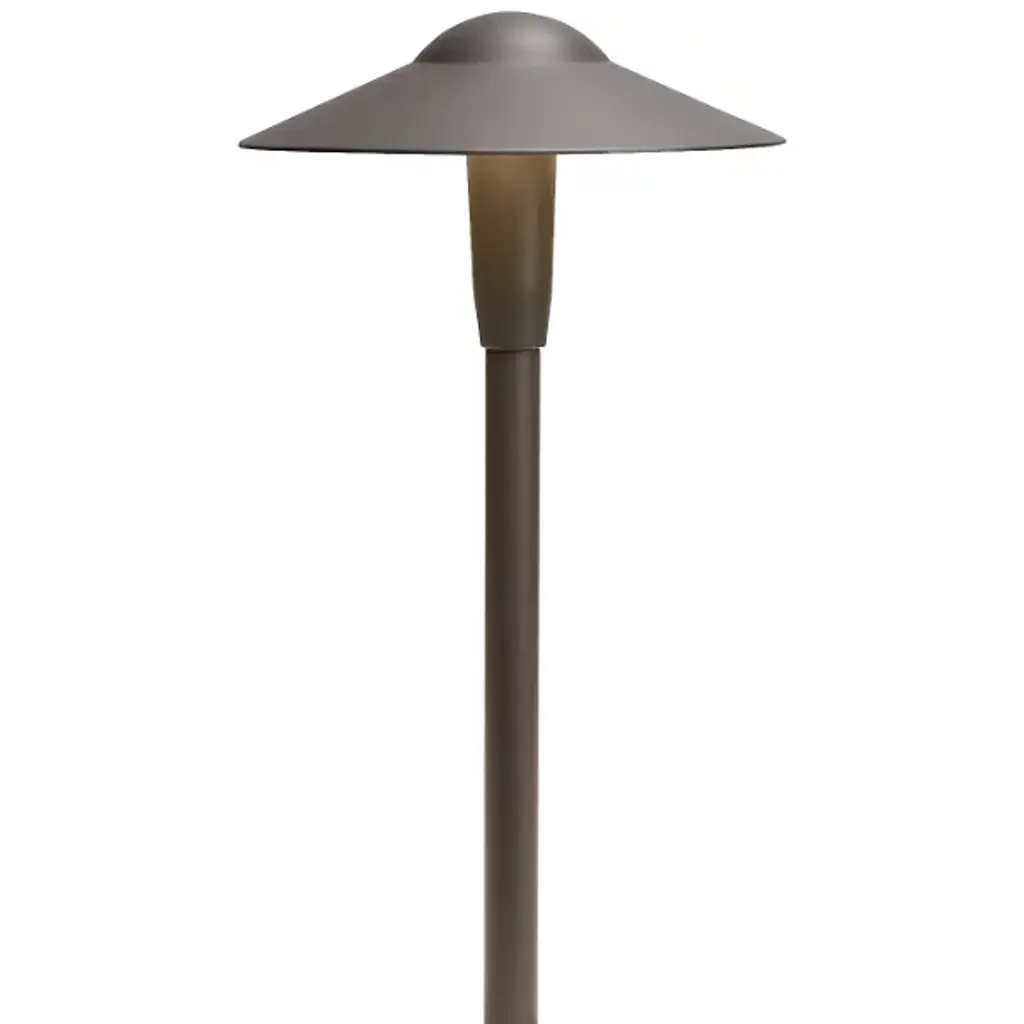 Blanket your walkway with the smooth, directed glow of the Small Dome LED Path Light from Kichler for a comfortable outdoor experience. The piece features a refined modern design that’s inviting in the bright day and at night. Staking firmly into the ground, the piece rises with a slim, handsome aluminum column. Intriguing in its saucer silhouette, the top hood protects your eyes from glare. The hood’s sharp angles give the LED light a downward-spanning distribution. The piece carves out a path of inviting light in a full 360-degrees.