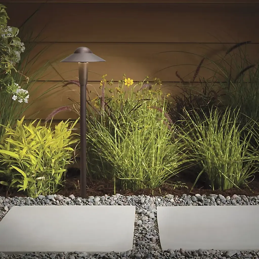 Blanket your walkway with the smooth, directed glow of the Small Dome LED Path Light from Kichler for a comfortable outdoor experience. The piece features a refined modern design that’s inviting in the bright day and at night. Staking firmly into the ground, the piece rises with a slim, handsome aluminum column. Intriguing in its saucer silhouette, the top hood protects your eyes from glare. The hood’s sharp angles give the LED light a downward-spanning distribution. The piece carves out a path of inviting light in a full 360-degrees.