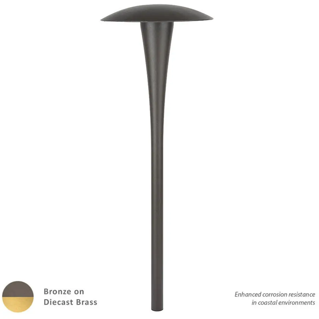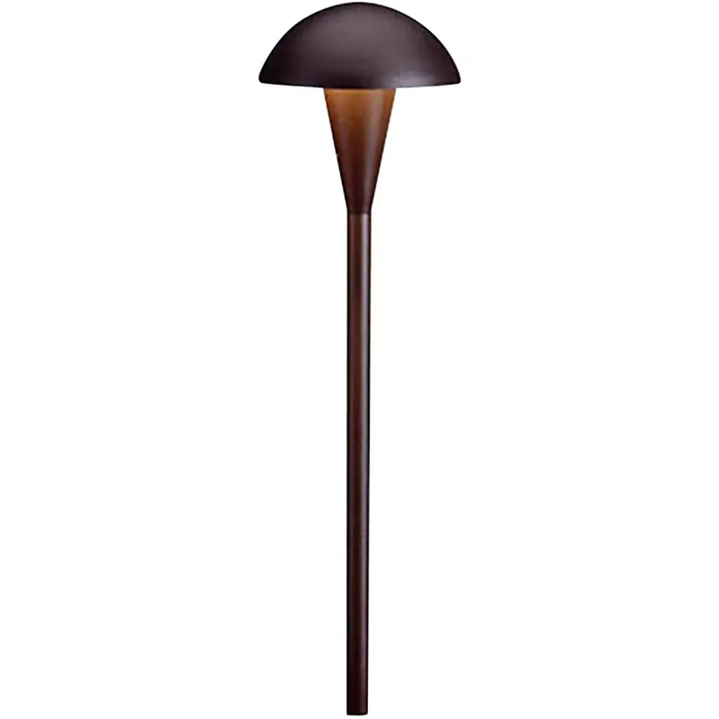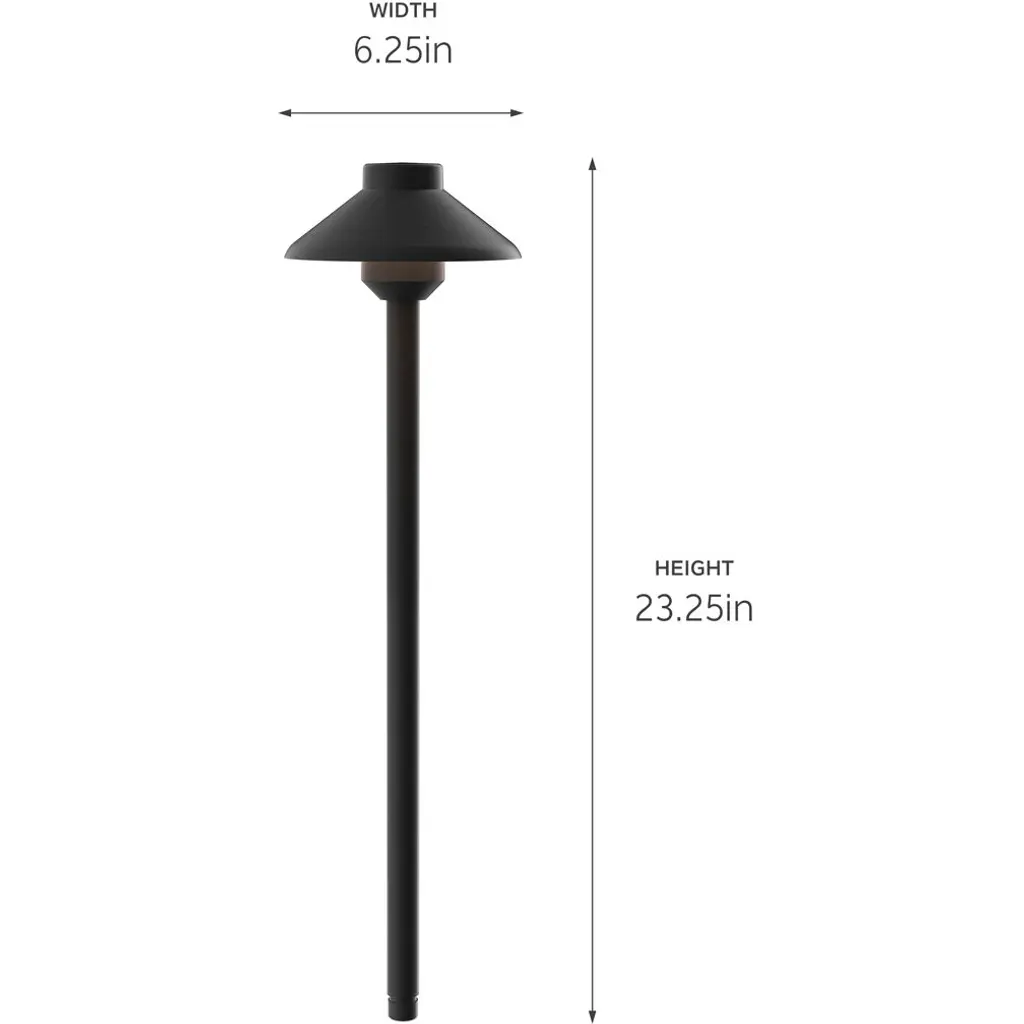 The Eclipse Path Light from Kichler presents its light through the frame of a wondrous circular form, translating the beautiful silhouette of the moon and light of the sun into a sharp minimalist construction. Subtle creases from the column emphasize the importance of form as well as functionality. A domed hood hovers over the piece, taking its light and fanning it down in a circular fashion onto its surface and its sleek metal construction.