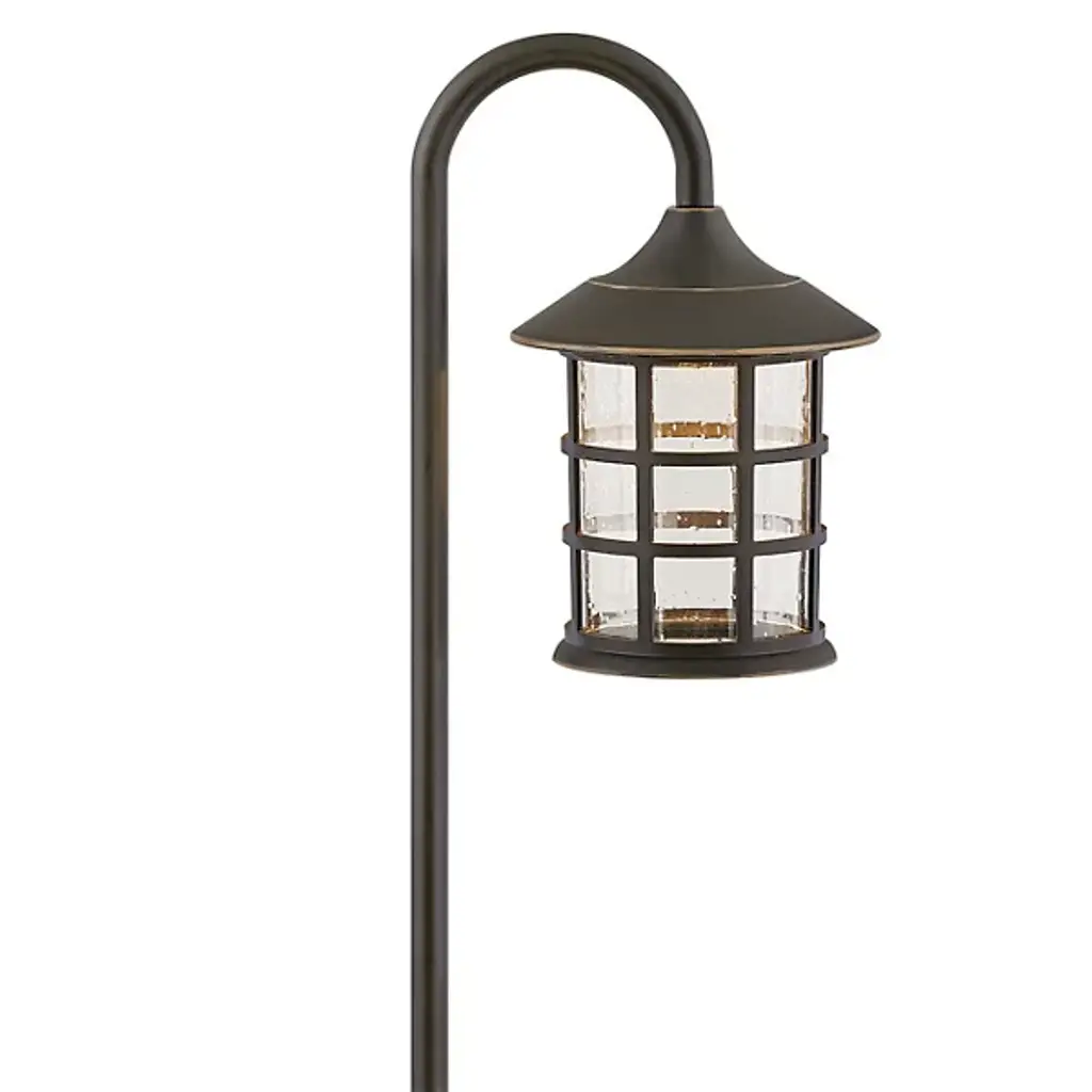 Carve out a walkway of comforting illumination with the Landscape Freeport Path Light from Hinkley Lighting. Even with the lights off, this piece pleases with its traditional New England aesthetic. It brings you the tried and true caged design, one made with durable composite material and encased in timeless clear seedy glass. A curved stem gives the structure a charming presentation, staking it firmly into the ground. When turned on, a warm ambient glow shines through the glass, creating a memorable silhouette.