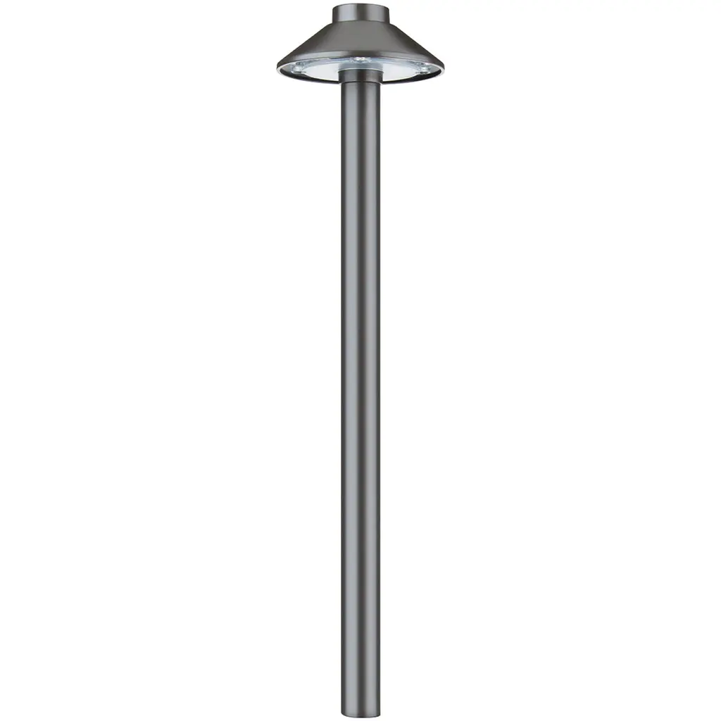 Simple, clean and efficient. The Interpath Path Light features a simple dome or cone minimalist top that provides an abundance of path lighting in a very discreet package. This path light is powered by bright long lasting integrated LED's and can conveniently tap into any existing 12V landscape lighting system. Factory sealed and water tight with an IP66 rating for protection against high-pressure water jets and outdoor elements. Casted using a special k-alloy aluminum that is engineered to withstand the most challenging environments over time. Solid brass coated in bronze (-BBR finish) may be available for enhanced protection against corrosive elements and is recommended for use in coastal or marine environments. Includes a 9in mounting spike (Guardian Spike sku 9000-SP9-BZ sold separately for more durable mounting) and a 3ft lead wire with two gel filled direct burial wire nuts. A magnetic or electronic power supply is required (sold separately) for 12V fixtures. A variety of accessories are sold separately for additional mounting options.