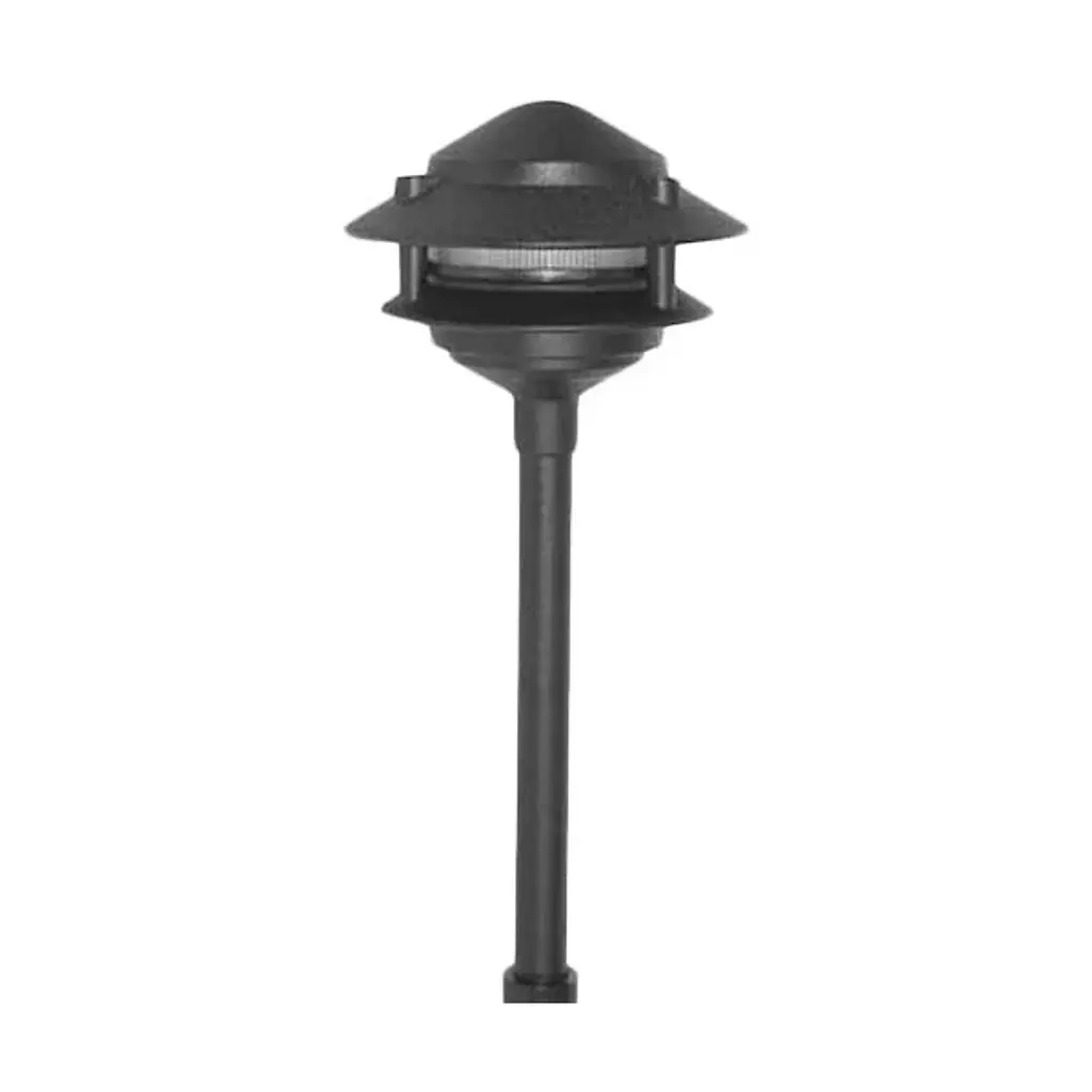 The Pagoda Area Light by Focus Industries features the iconic, yet highly functional pagoda hat on a low-profile stem that mounts directly into the ground with a 9” ABS stake. Its Asian-themed, tiered-tower form funnels light downward to illuminate the surrounding area. The hat and stem are made of cast aluminum and are available in a variety of finishes for a customized look. The fixture connects to a 12v landscaping electrical system. Transformer is necessary but not included.