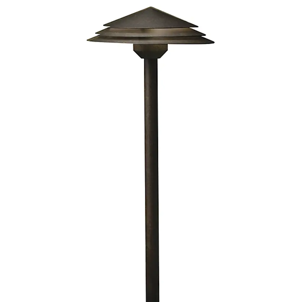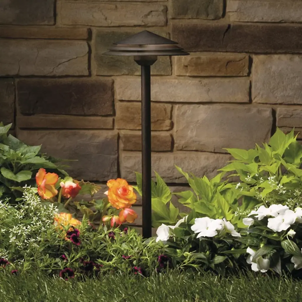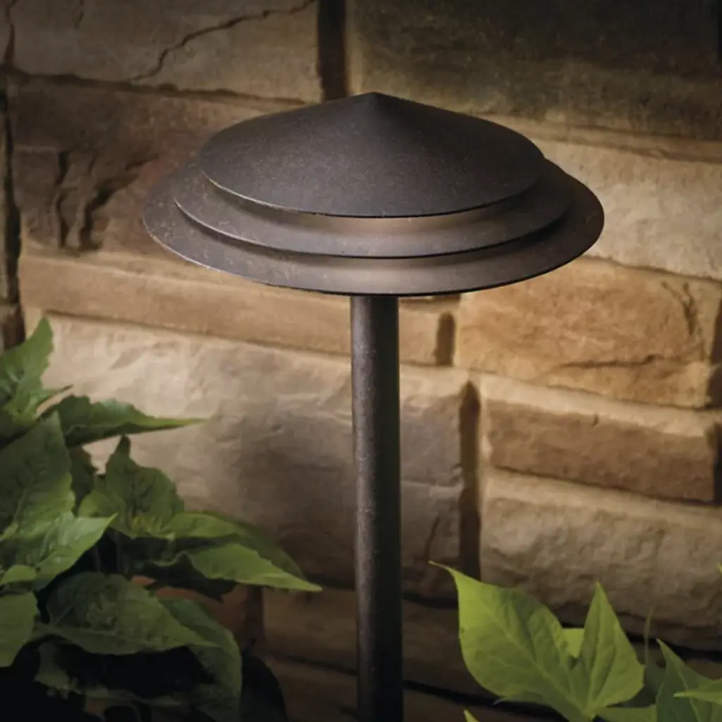 Bring a new light source to the comfort of the landscape outside your home with the Round Tiered LED Path Light from Kichler. Made of smooth metal throughout, this piece features a slim and tall body that leads to a tiered, angled top consisting of a pointed peak. The LED light source within sheds from beneath the tiers, appearing as a warm white glow perfect for marking pathways or drawing attention to a particular feature of your yard.