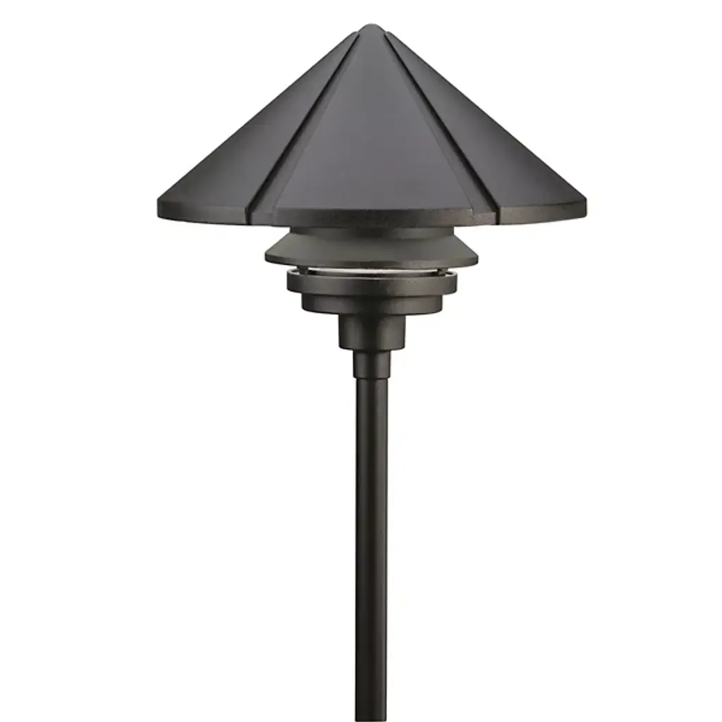 Bring a bold and elegant addition to your outdoor path and patio spaces with the Six Groove Large Path Light from Kichler. A durable aluminum construction, it relies on a sleek aluminum stem to support a wet-rated lamp beneath a conical shade. The shade’s surface is divided into triangular segments, creating a layered, sculptural look, while a beveled louver around the lamping cuts bright glare in favor of a distributed wash of downlight.