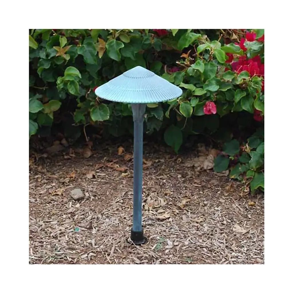 The Small Aluminum Tiki Area Light by Focus Industries features a textured, multi-layered hat that guides light downward to illuminate the surrounding area. Its narrow stem has a 9” ABS stake that mounts directly into the ground, allowing you to position the fixture according to your needs. Connects to a 12v landscaping electrical system. Transformer is necessary but not included.