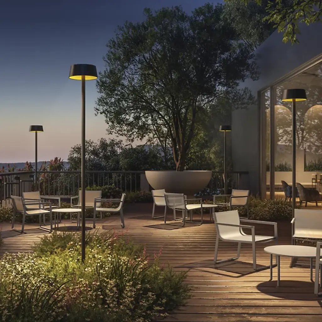 The Sundress Outdoor LED Path Light from Zafferano America offers a playful yet refined touch suited to large outside spaces. Designed by Serge Cornelissen, this contemporary fixture features a wide, flared top that sits at the end of a slender pole—the cone of light reminiscent of a sundress caught in motion. Its soft LED glow spreads evenly below, enhancing outdoor spaces with subtle charm. Made from die-cast aluminum with a durable epoxy-polyester coating, it’s built with longevity in mind, fueled by a solar panel under tempered glass, with a daylight sensor and stainless steel hardware for reliable, energy-efficient lighting.